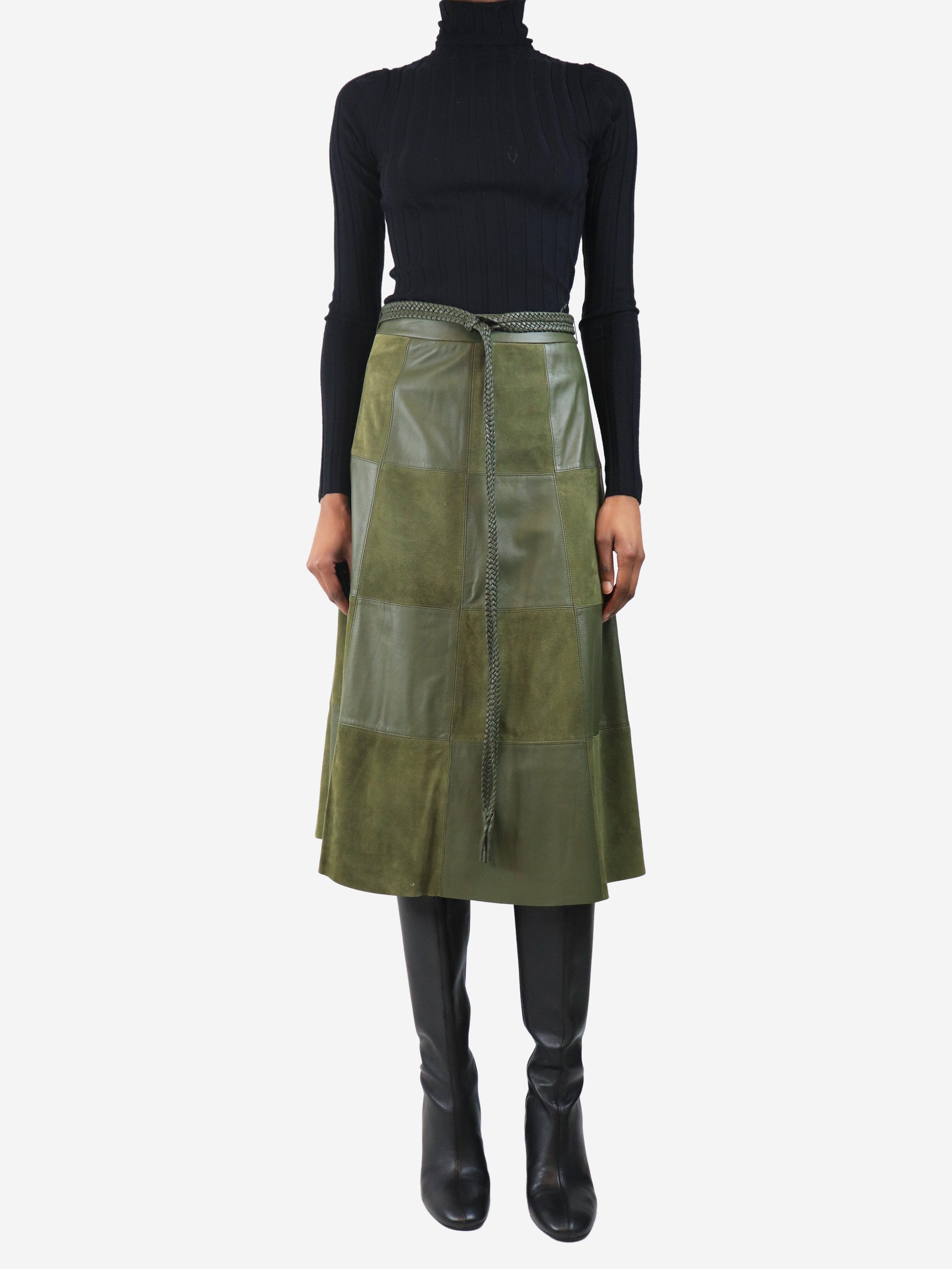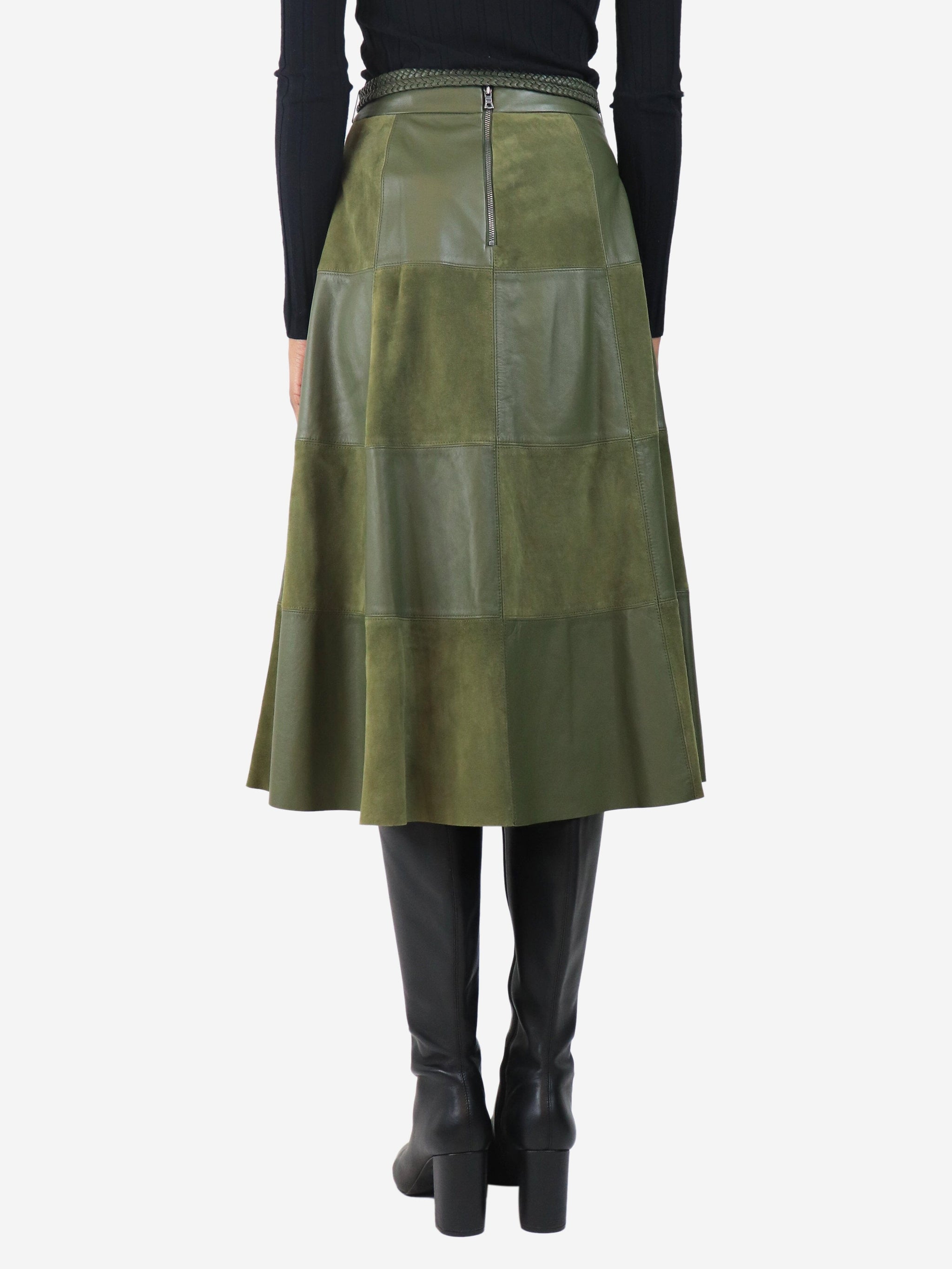 Green suede and leather patchwork midi skirt - size UK 8