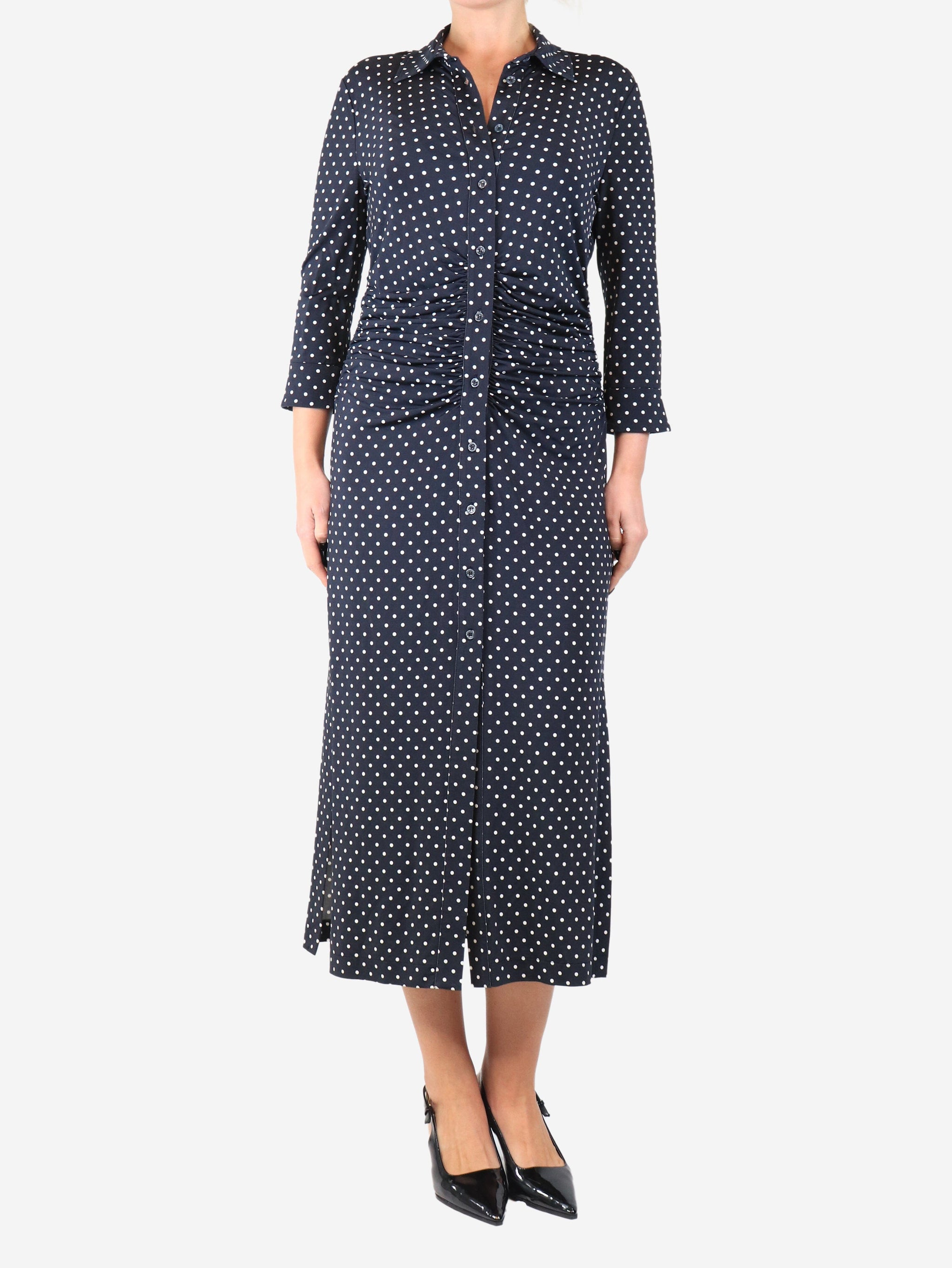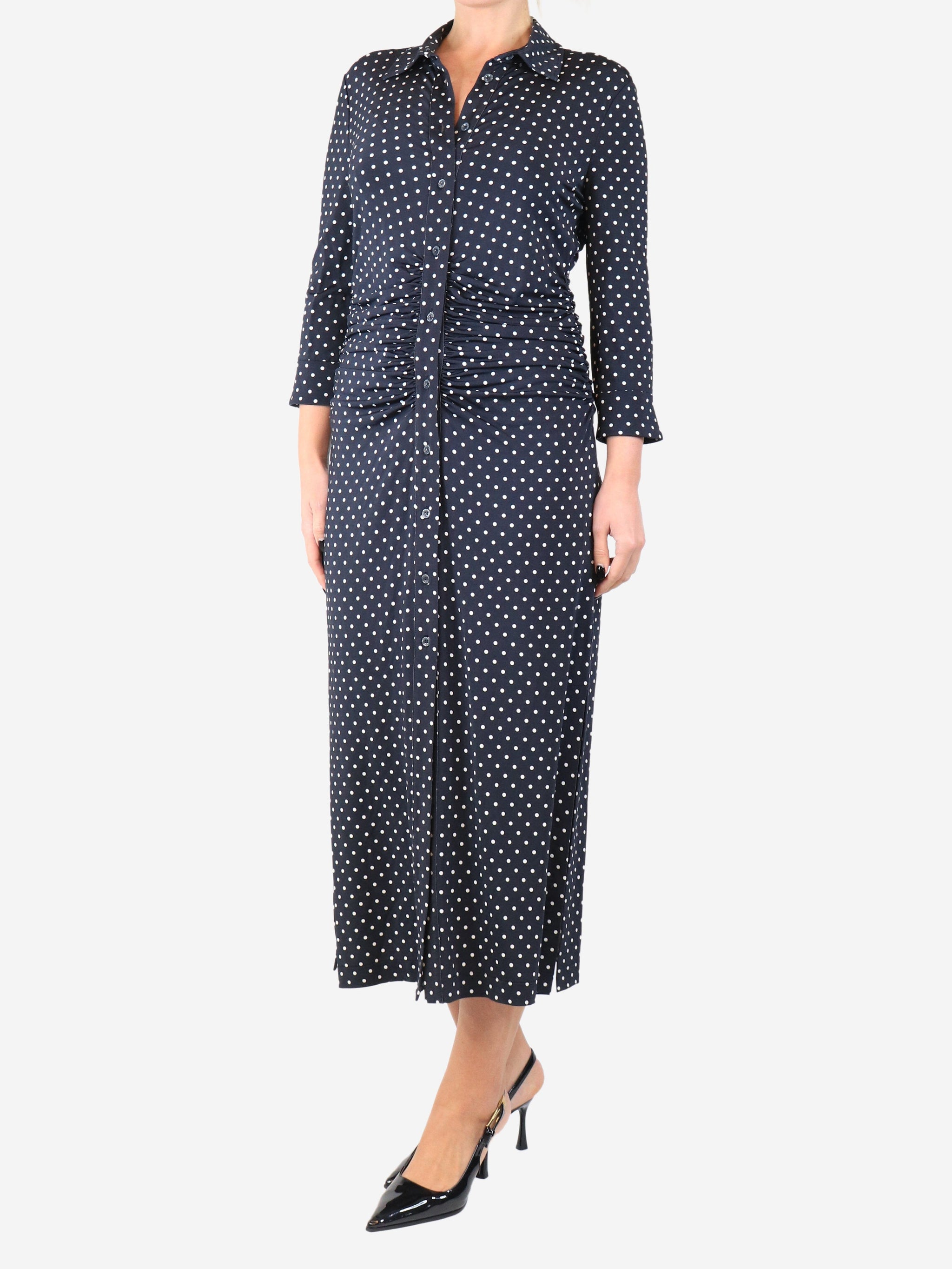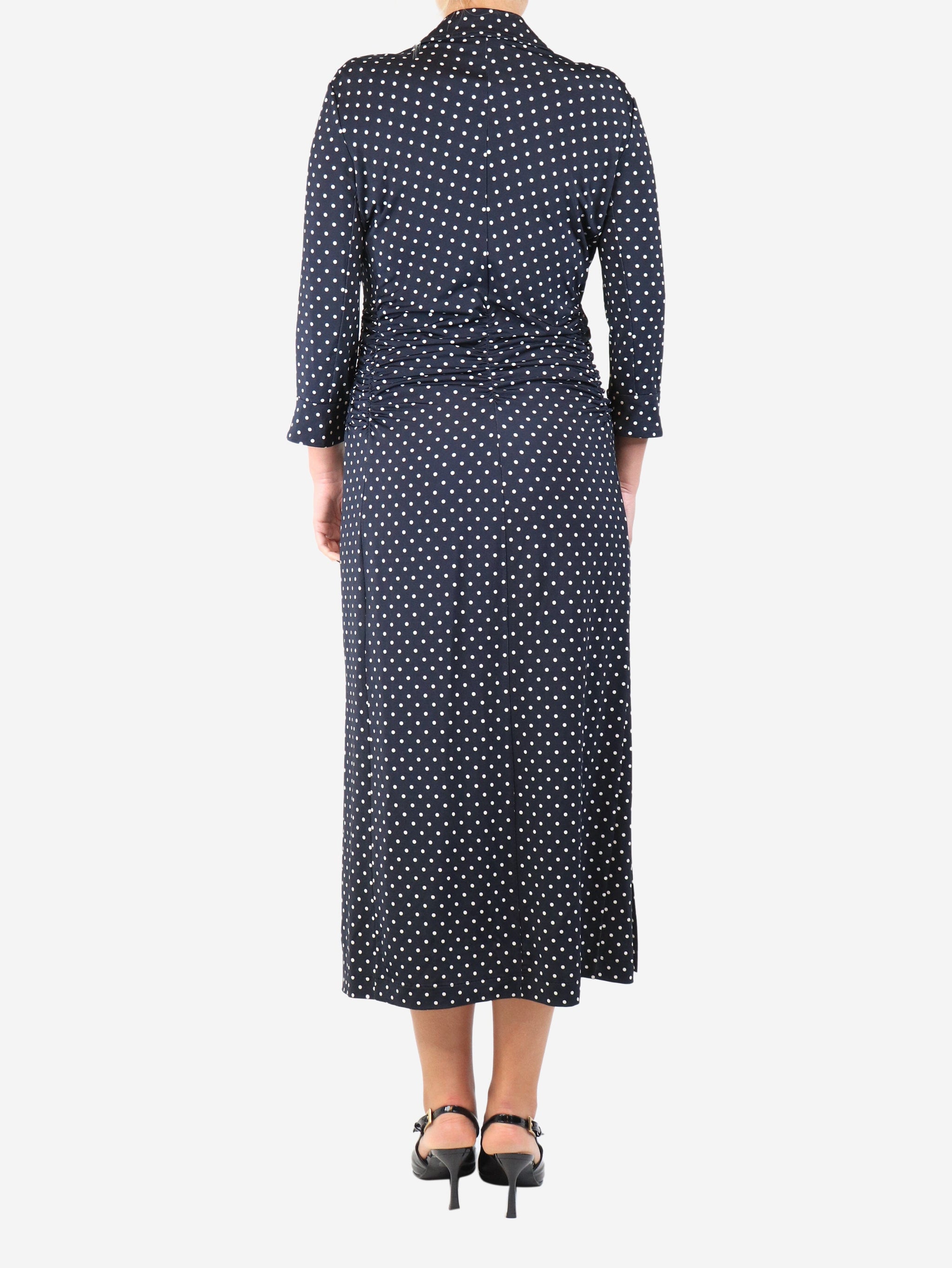 Navy blue ruched polka dot midi dress - size UK 14