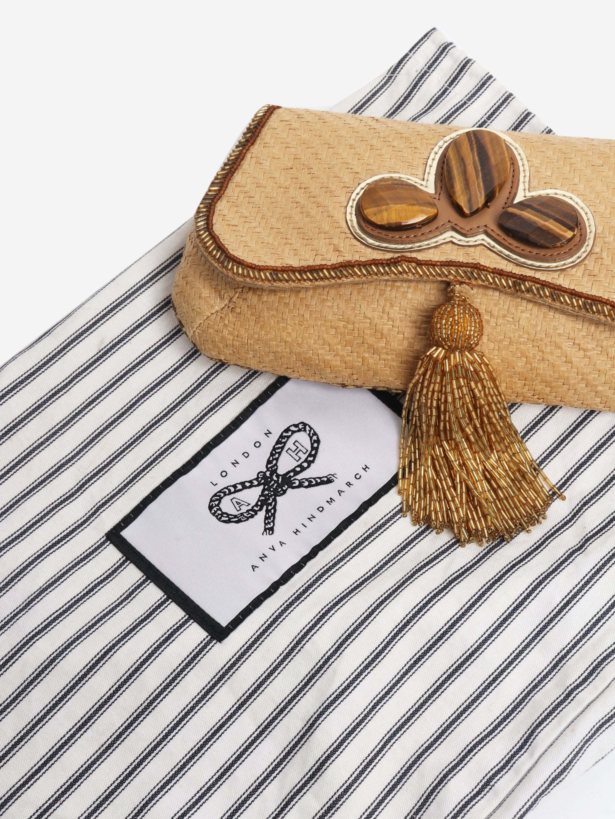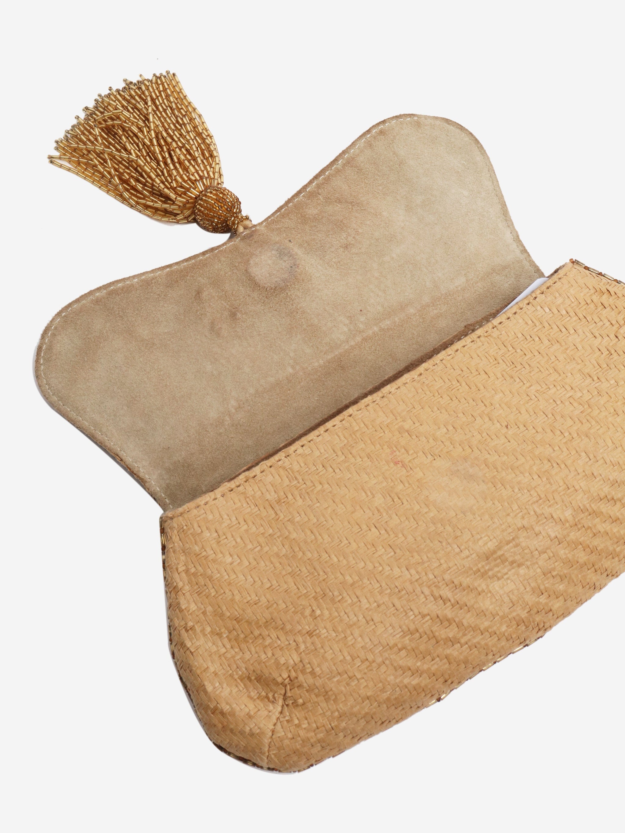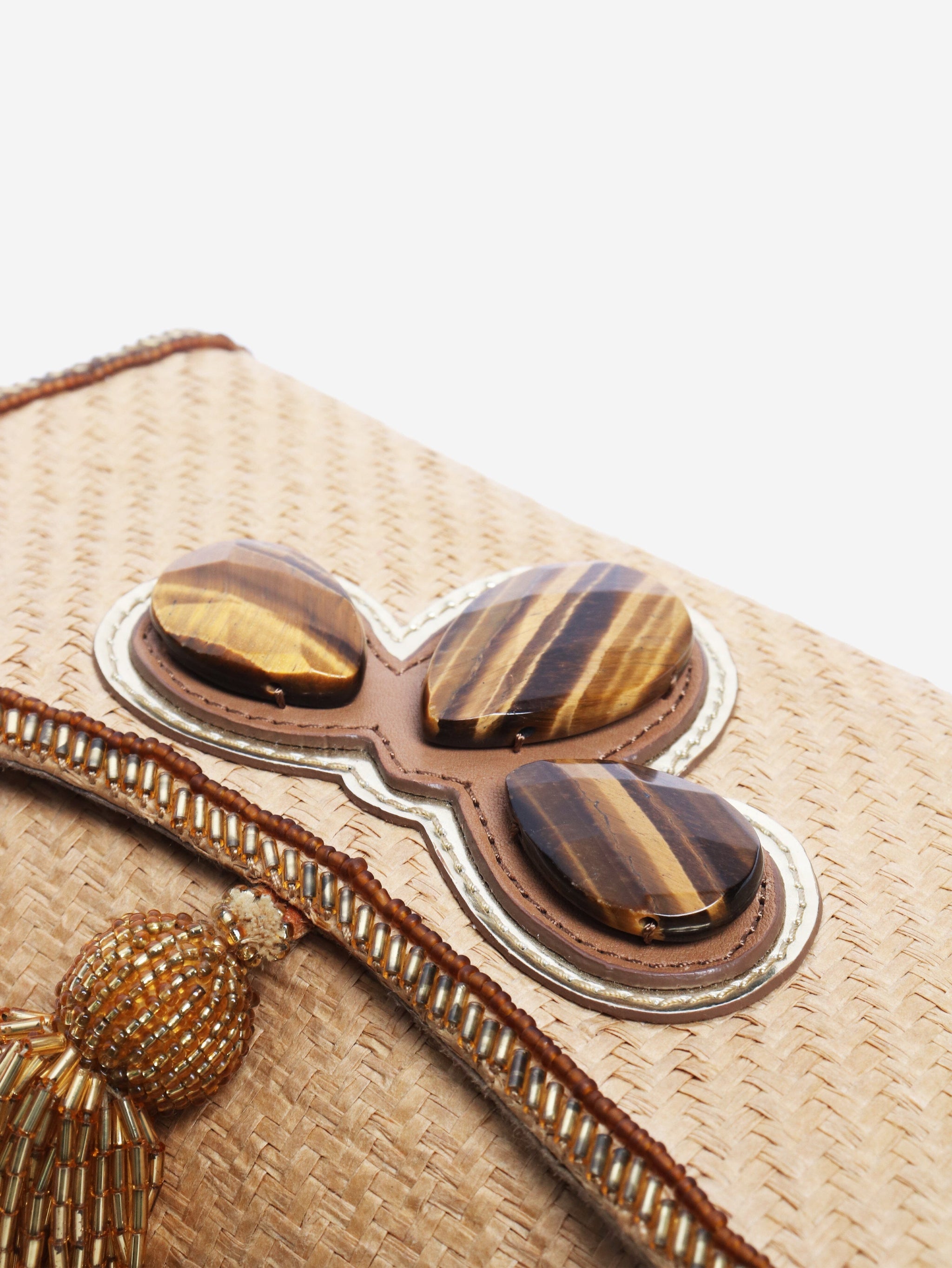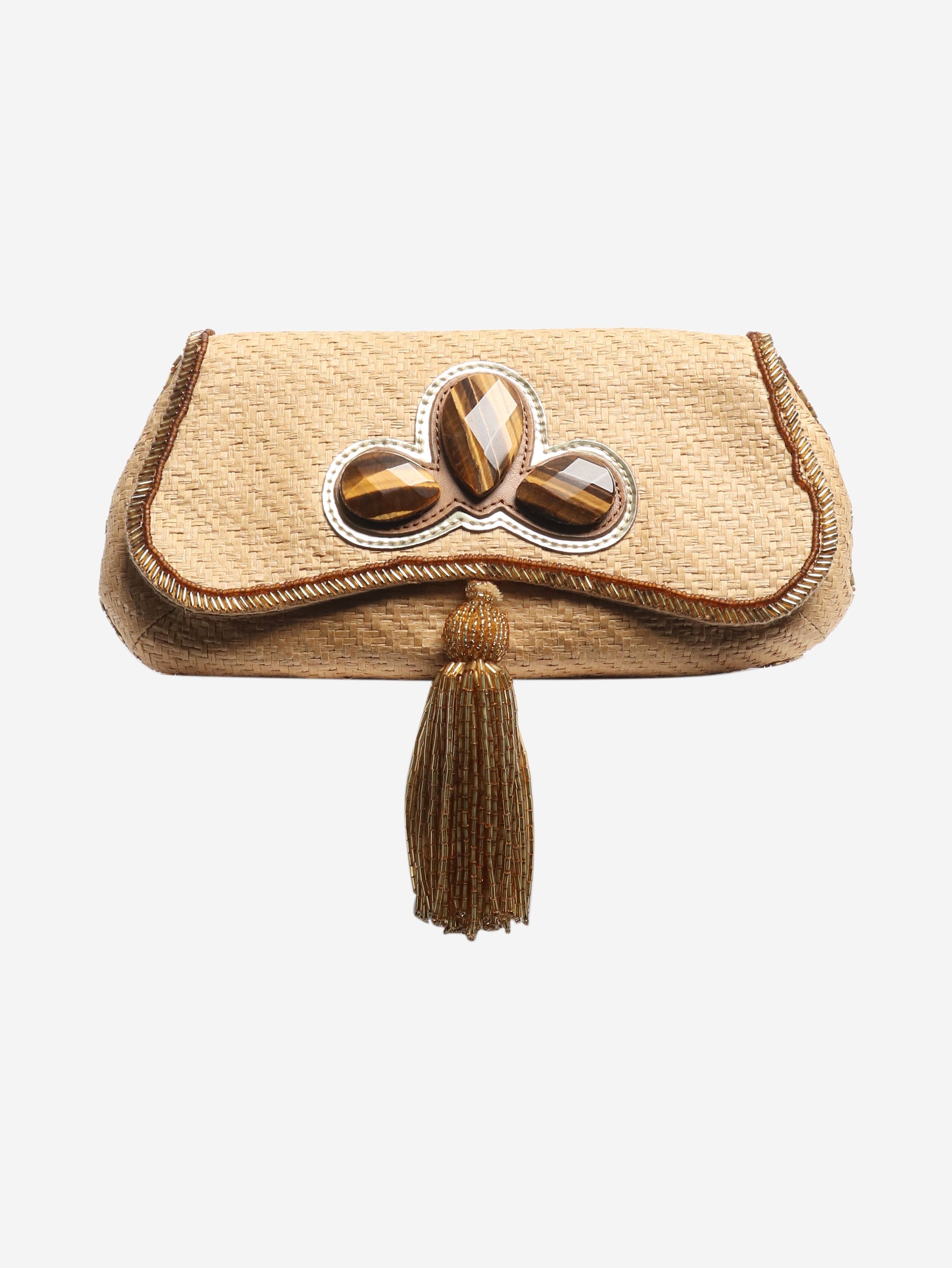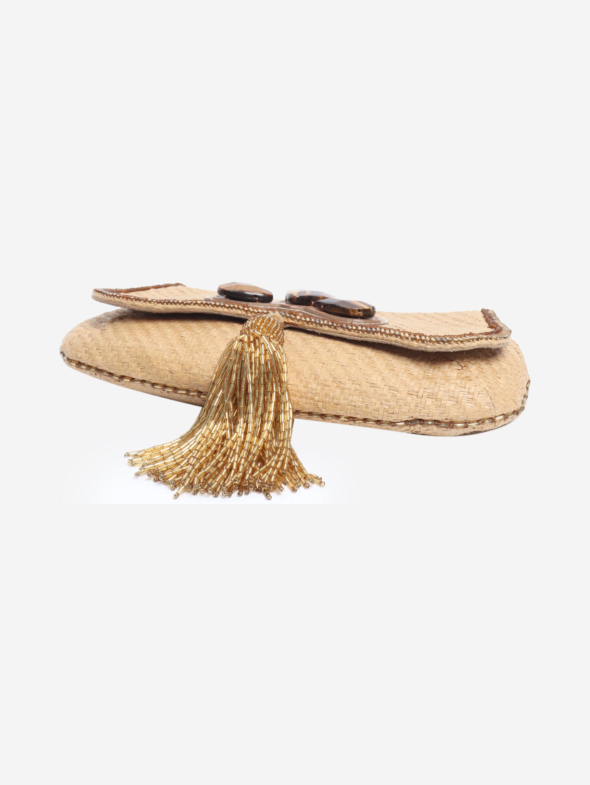 Neutral raffia clutch bag with tassel