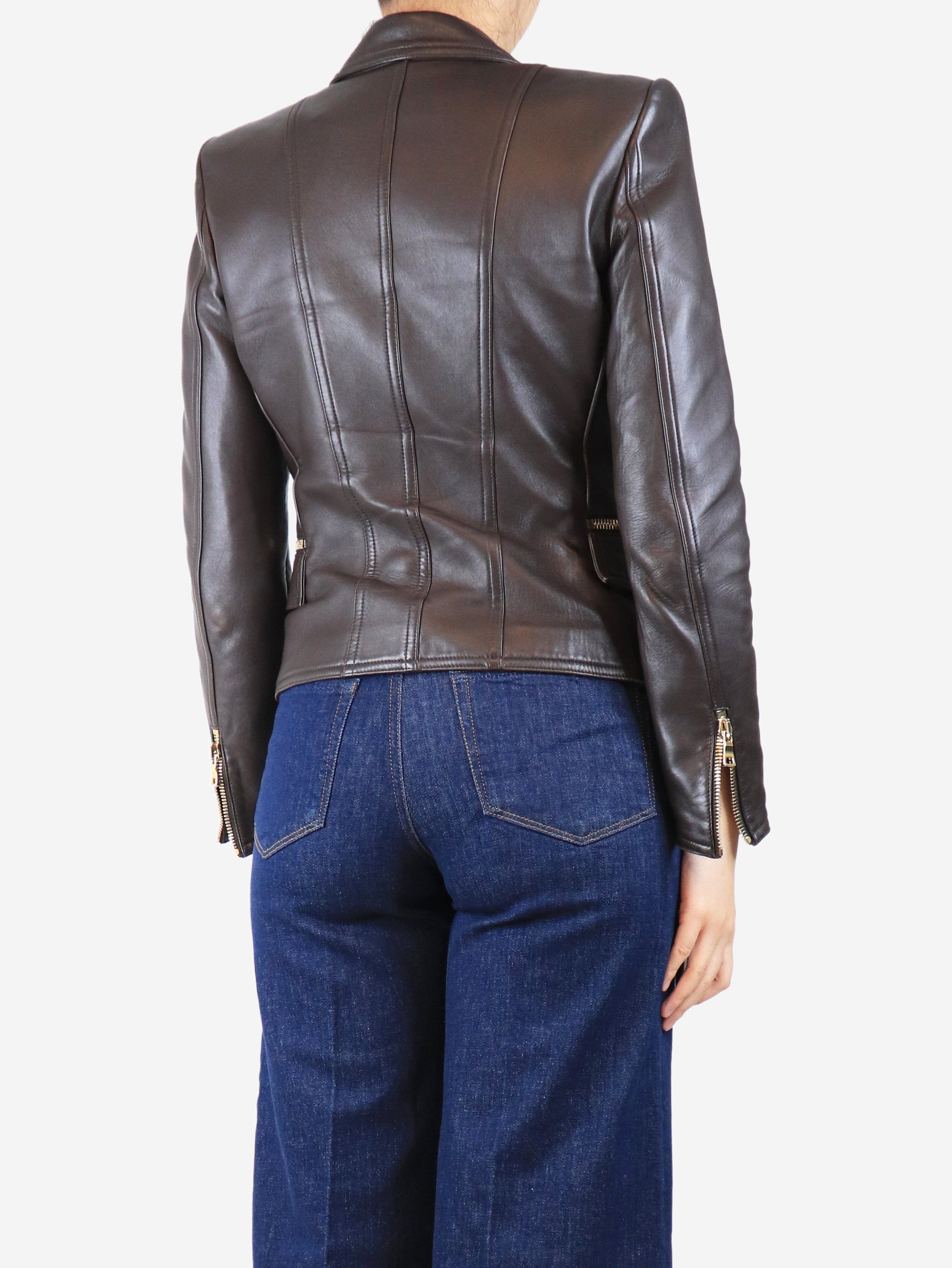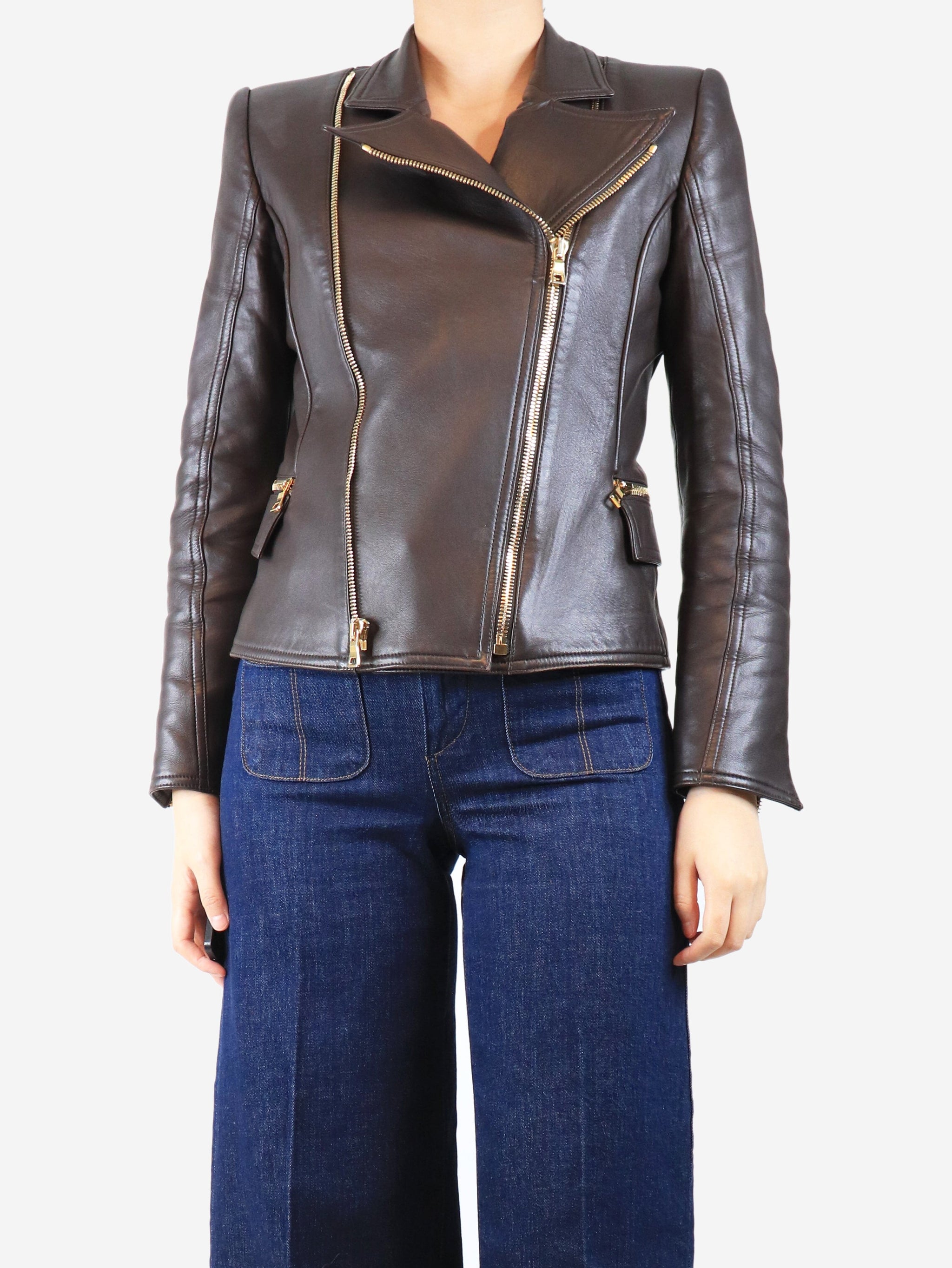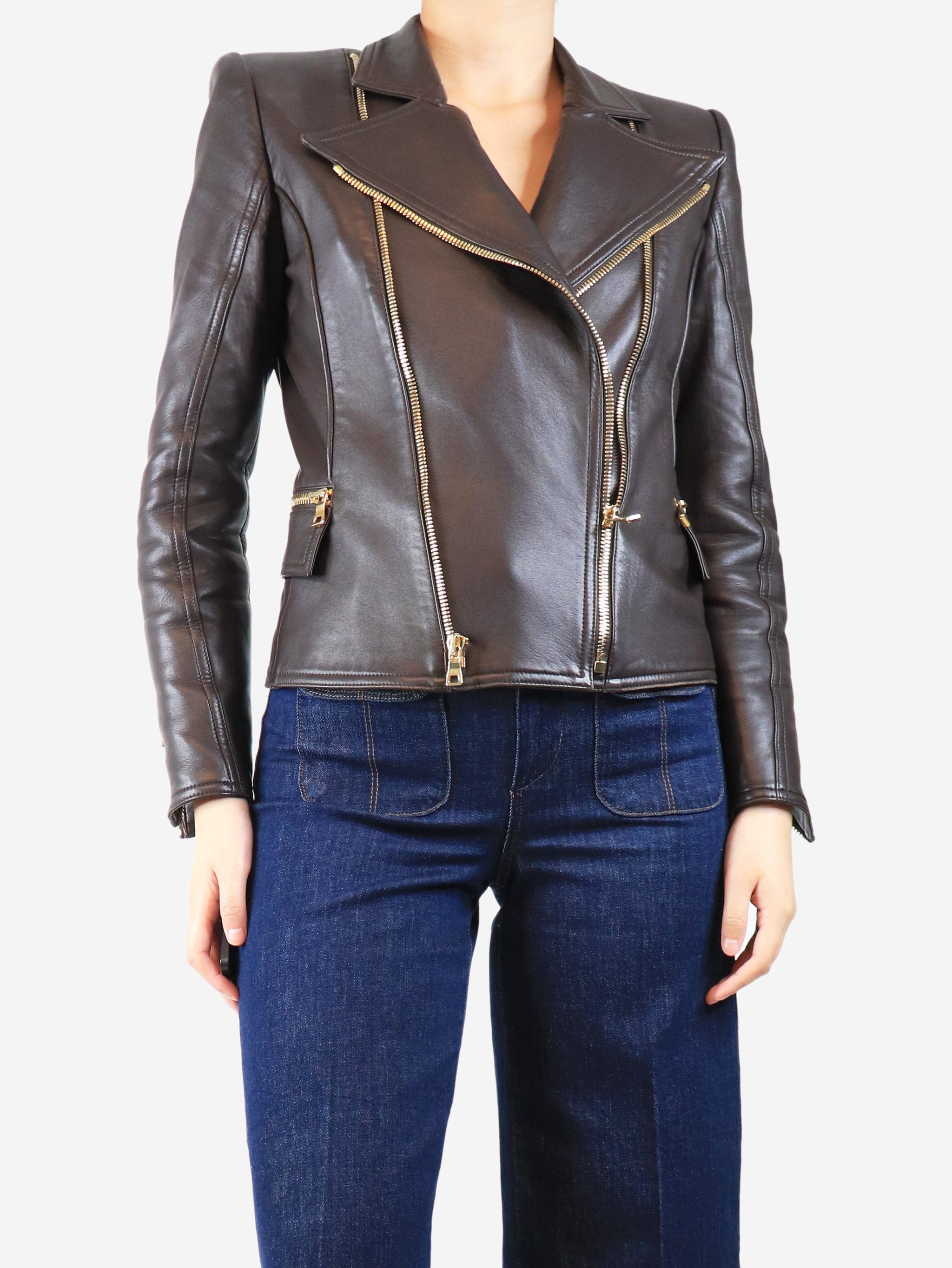 Brown leather biker jacket - size UK 12