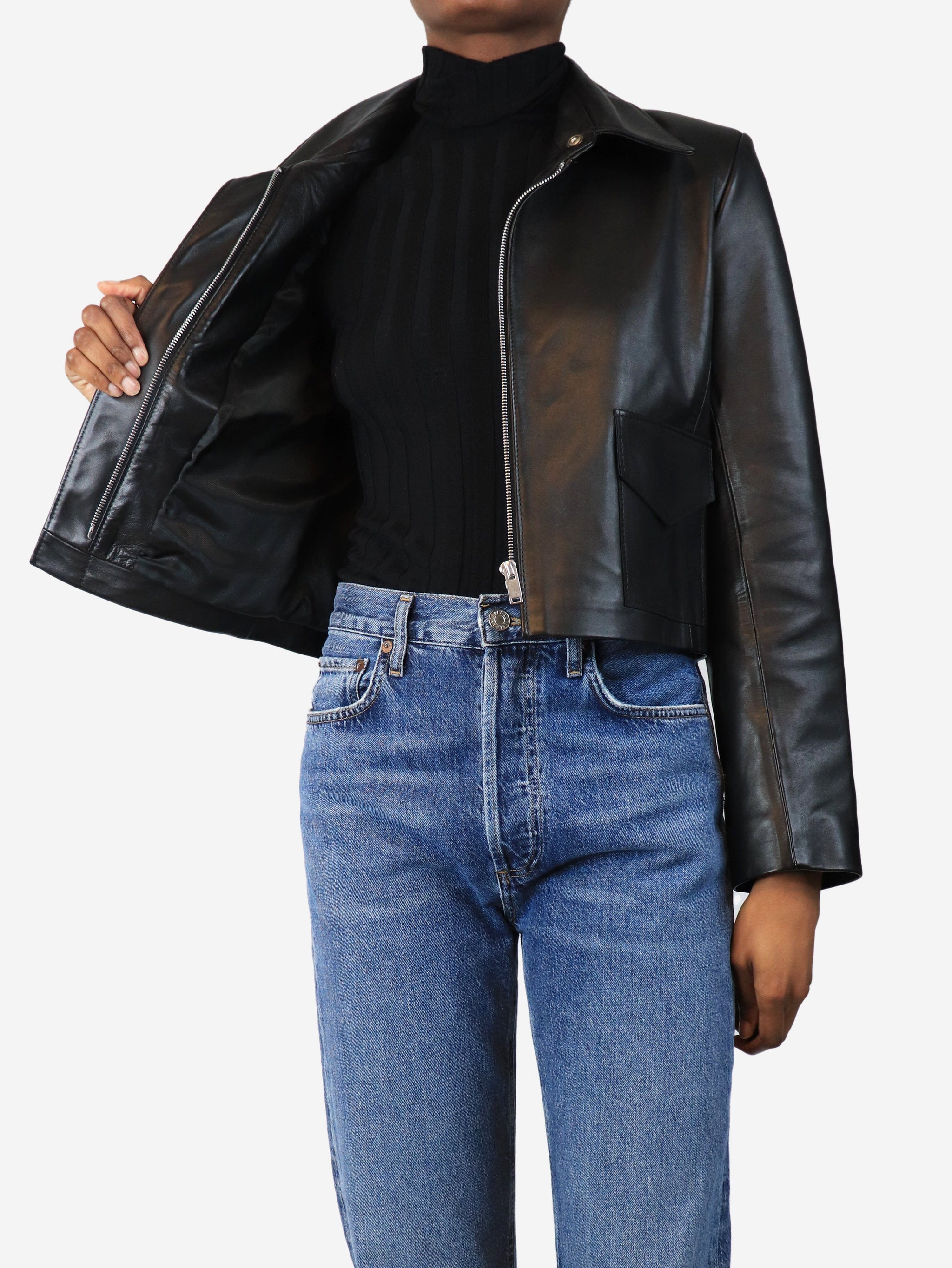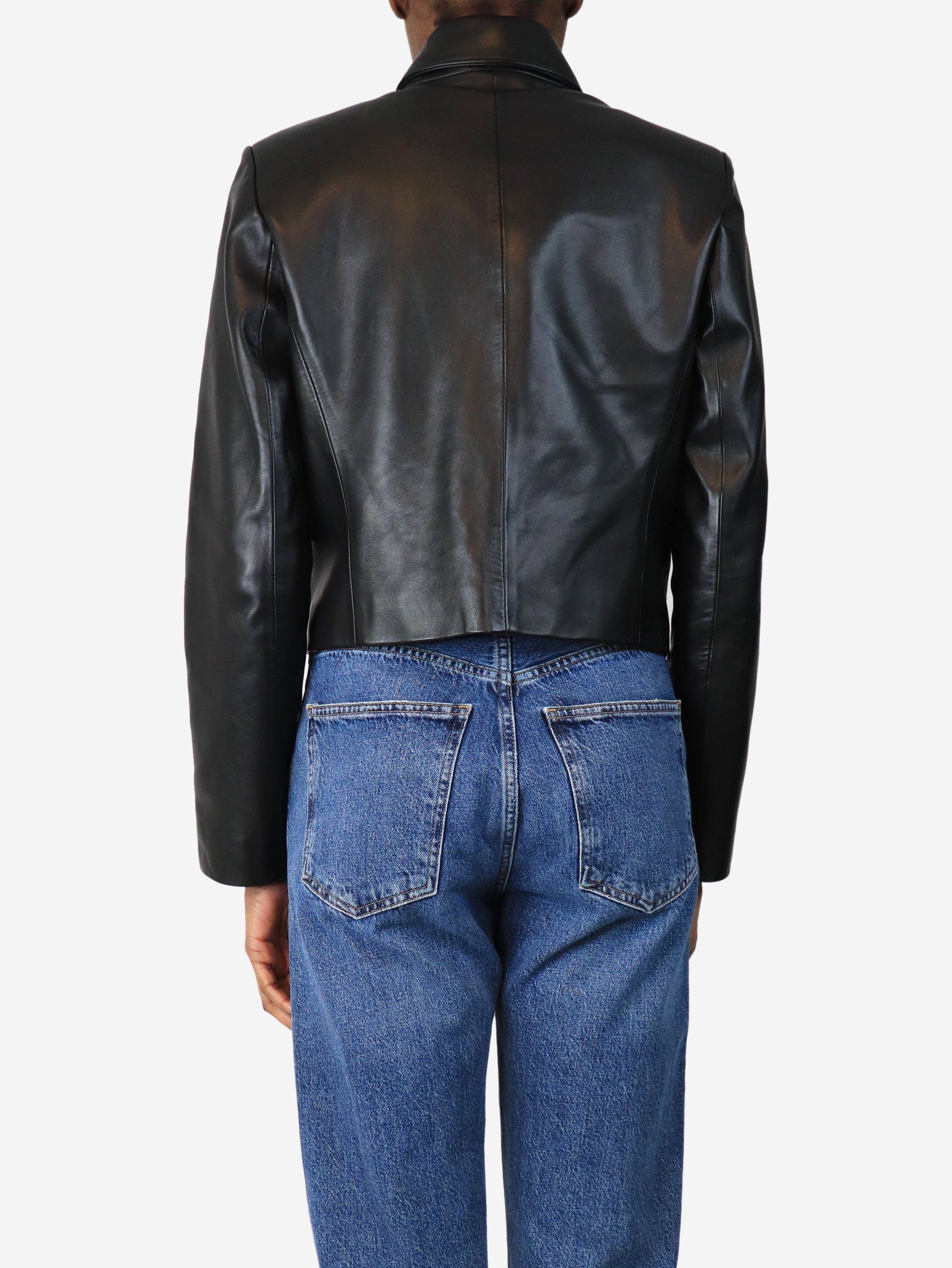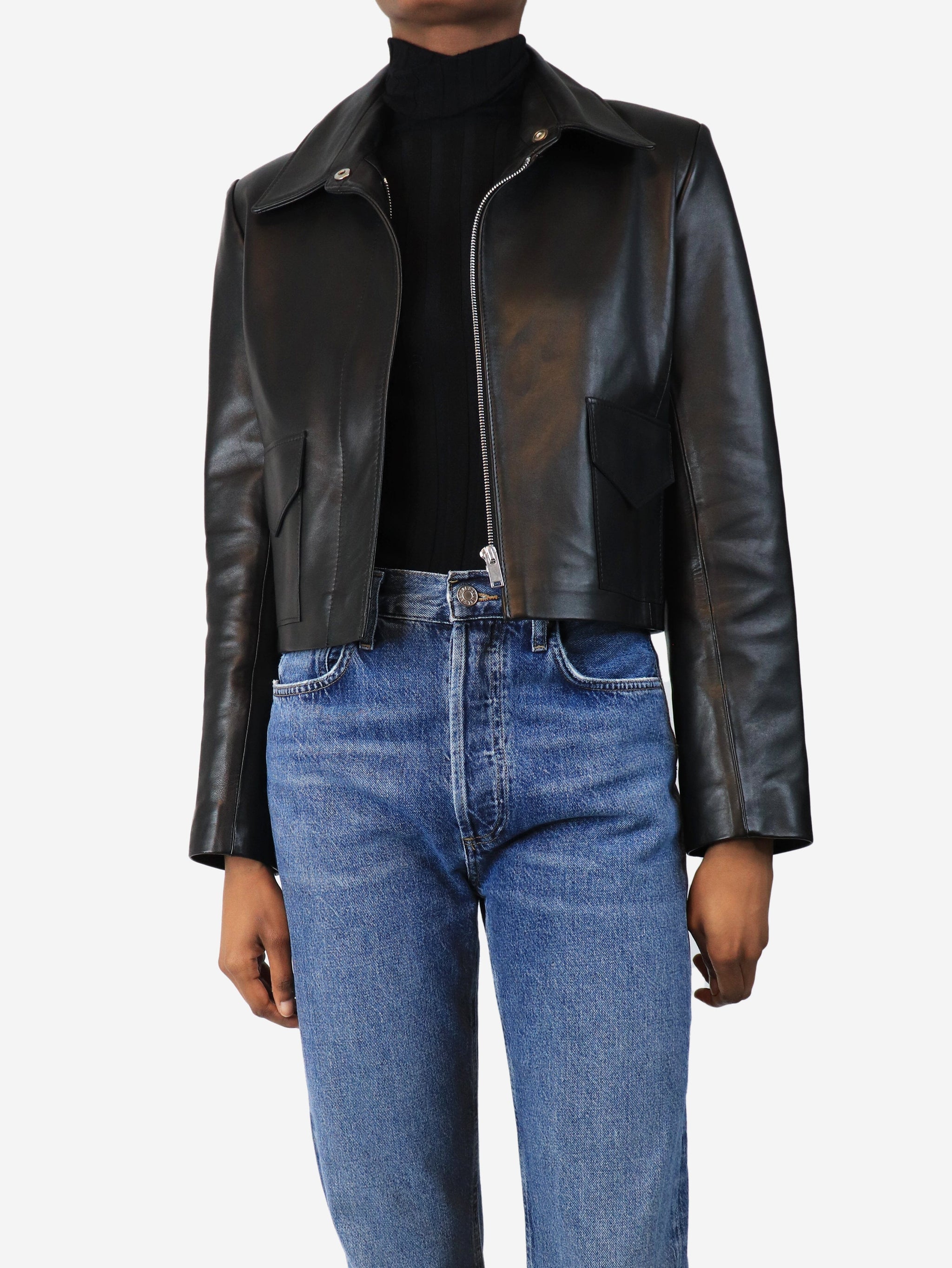 Black cropped leather jacket - size UK 6