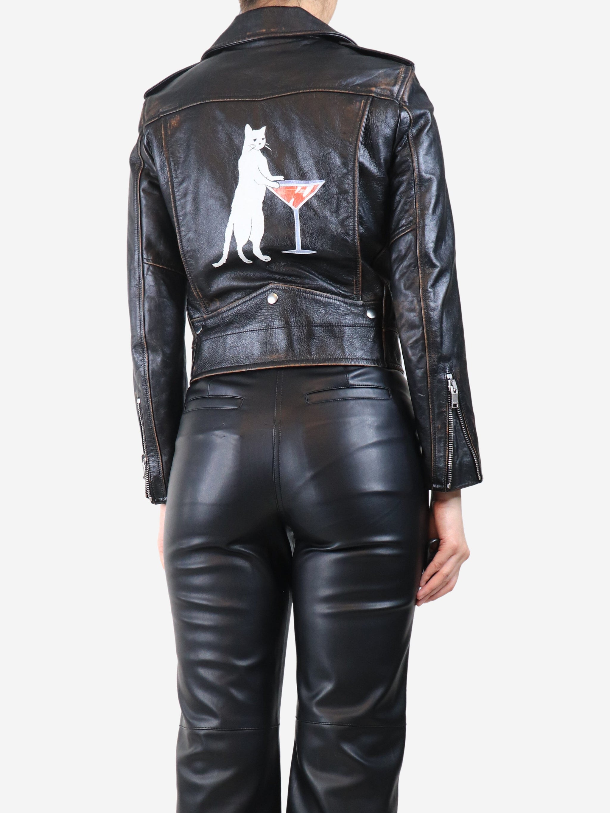 Black leather printed biker jacket - size UK 10