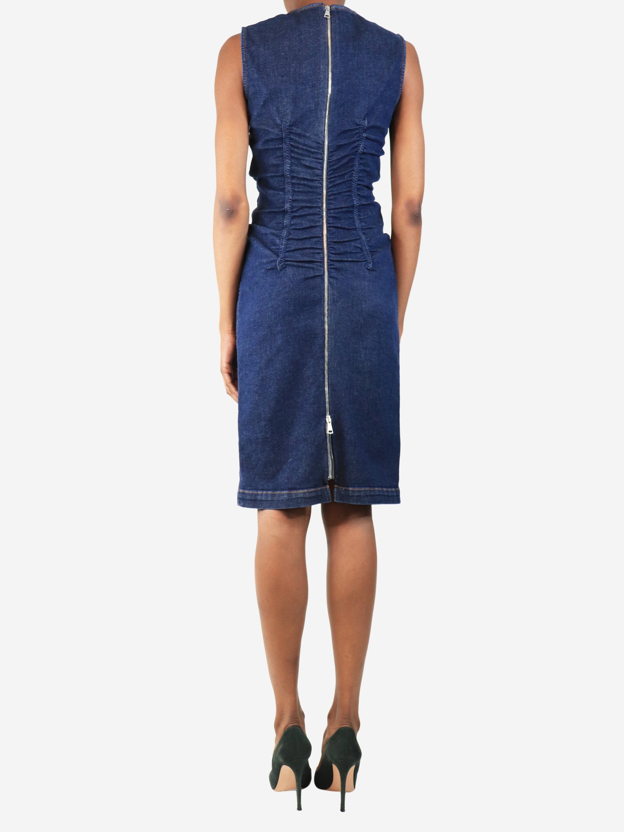 Blue sleeveless denim ruched midi dress - size UK 6