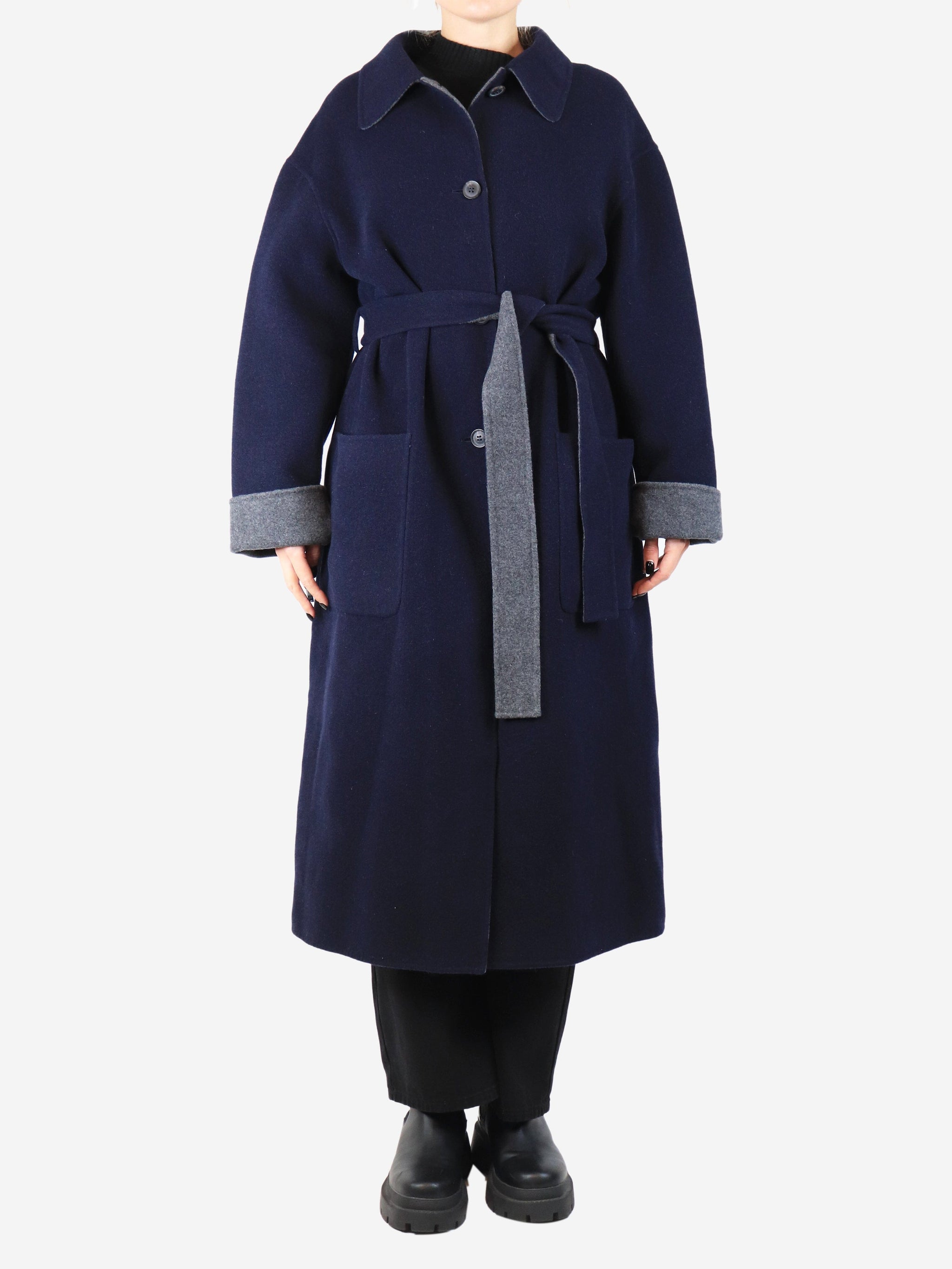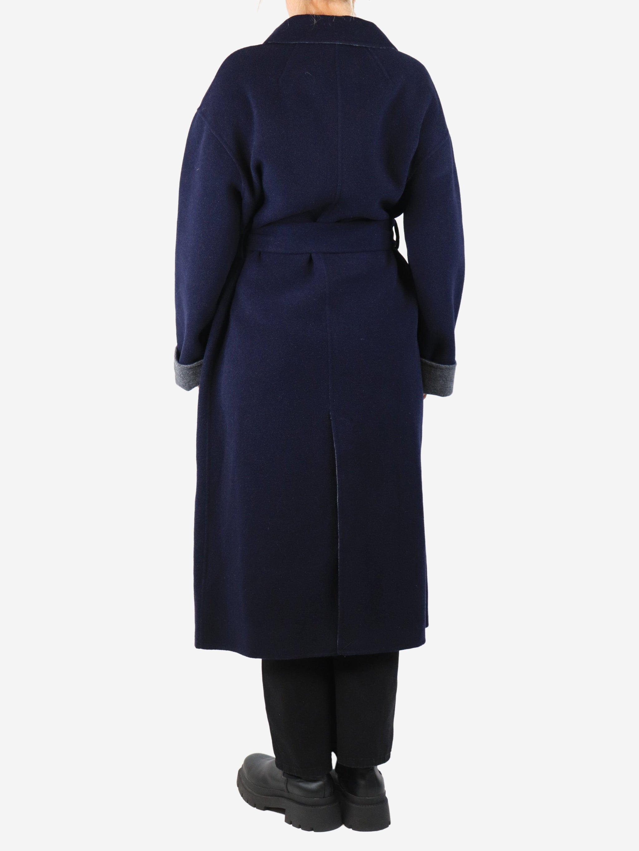 Dark blue and grey belted long cashmere coat - size UK 14