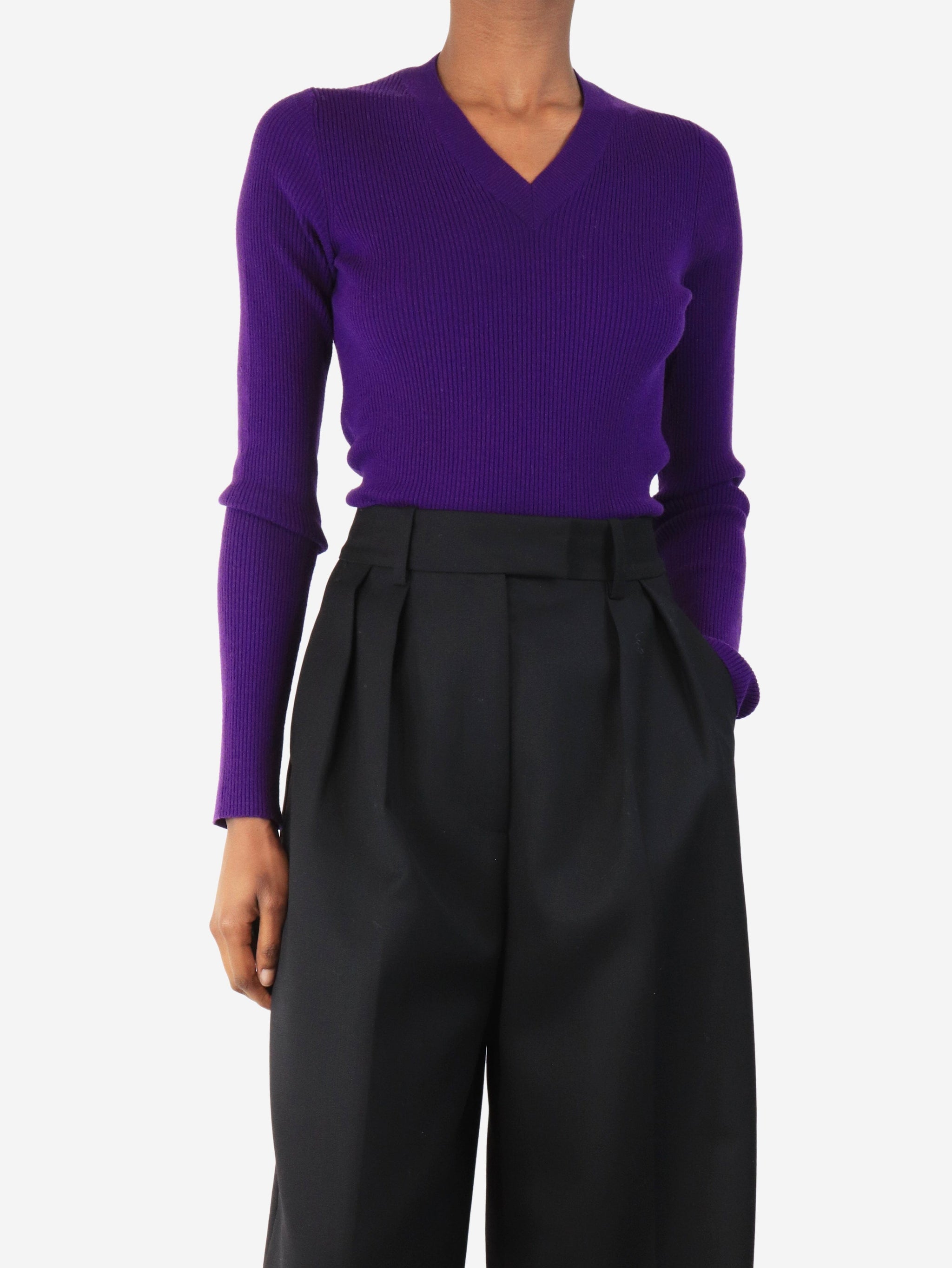 Purple ribbed v-neck knit top - size XS