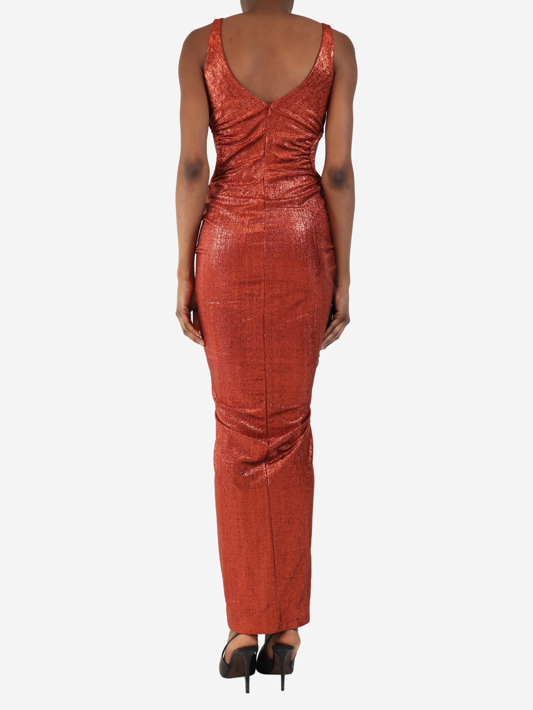 Burnt orange sparkly ruched dress - size UK 10