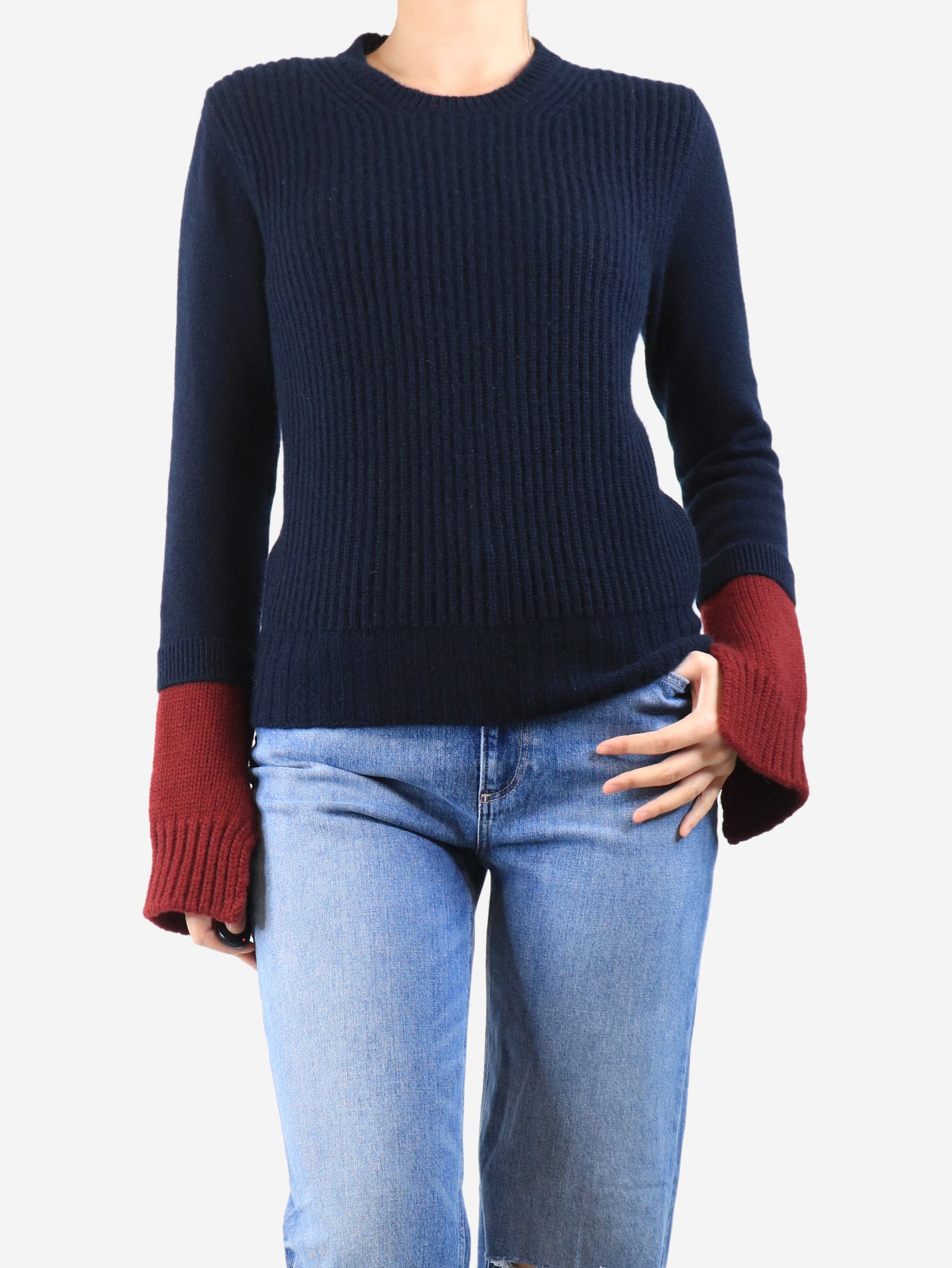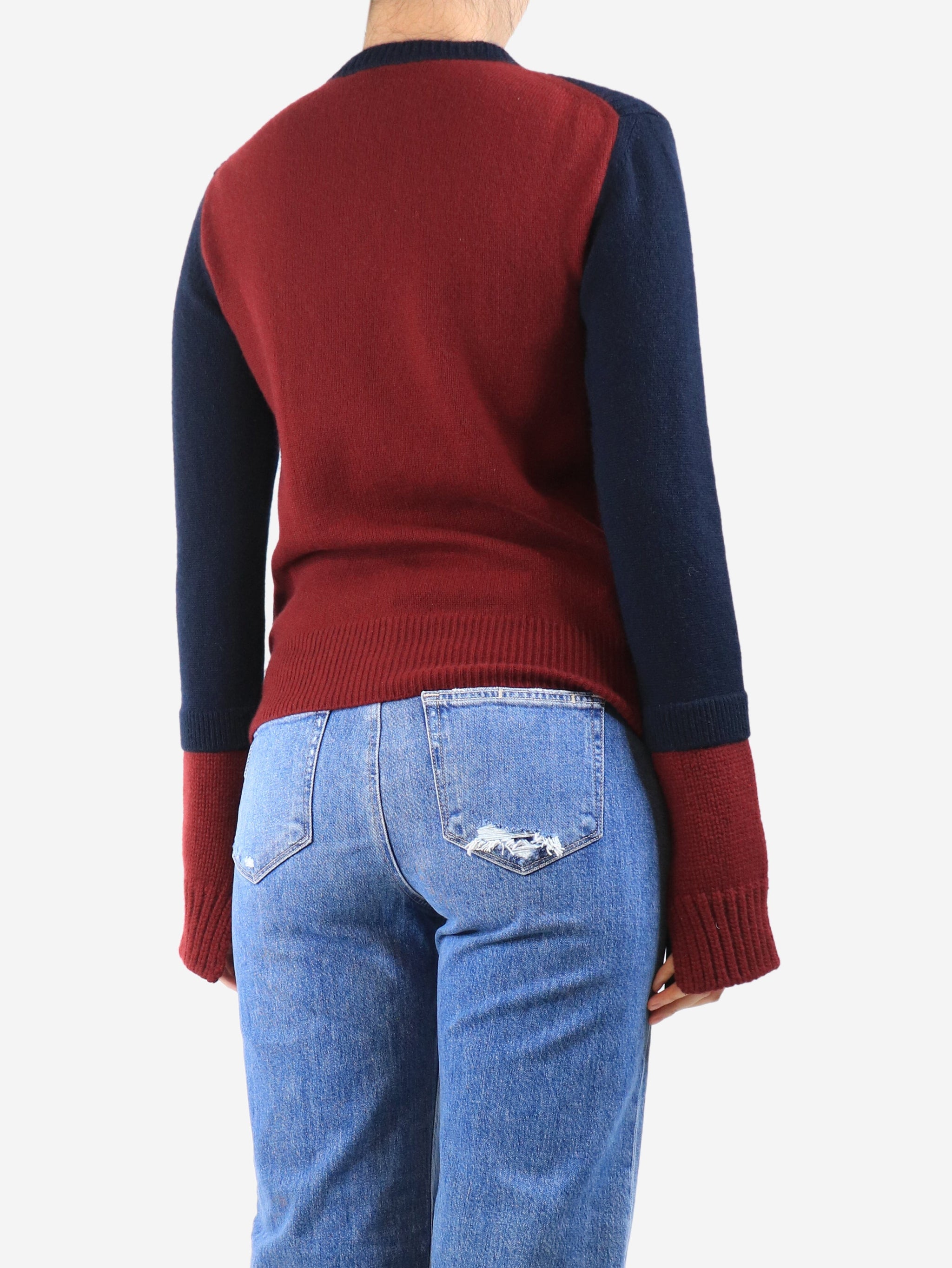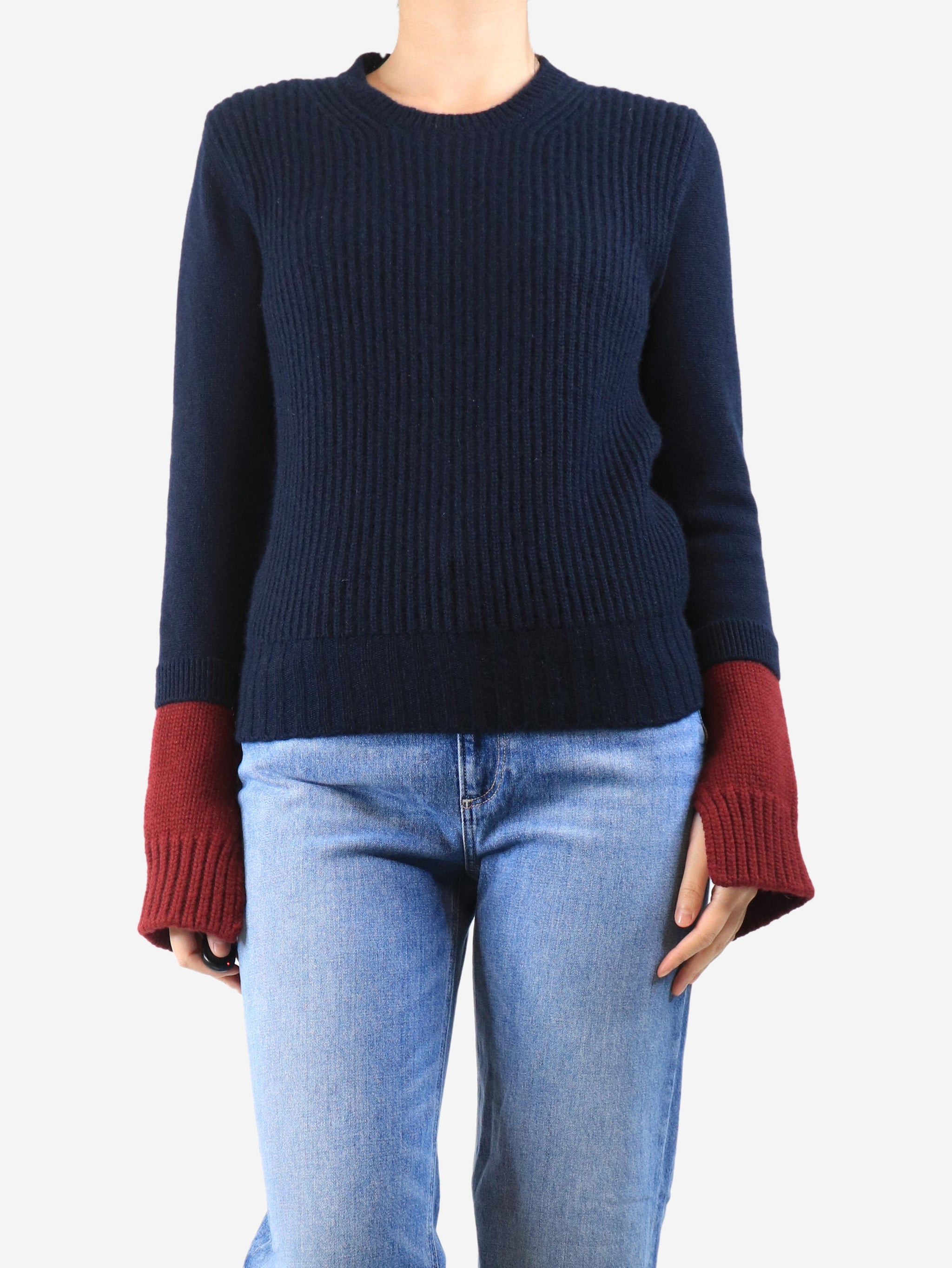 Navy and maroon ribbed cashmere colourblock jumper - size M