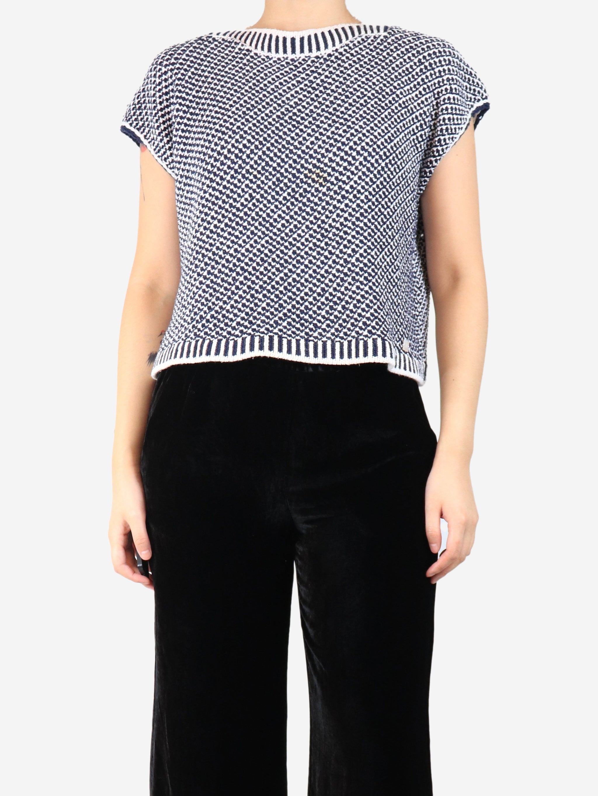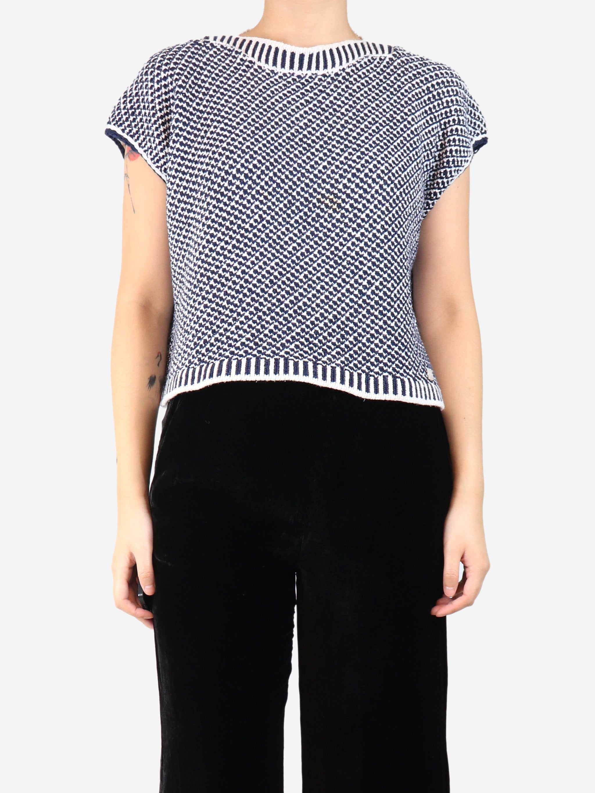 Dark blue and white sleeveless knit top - size UK 14