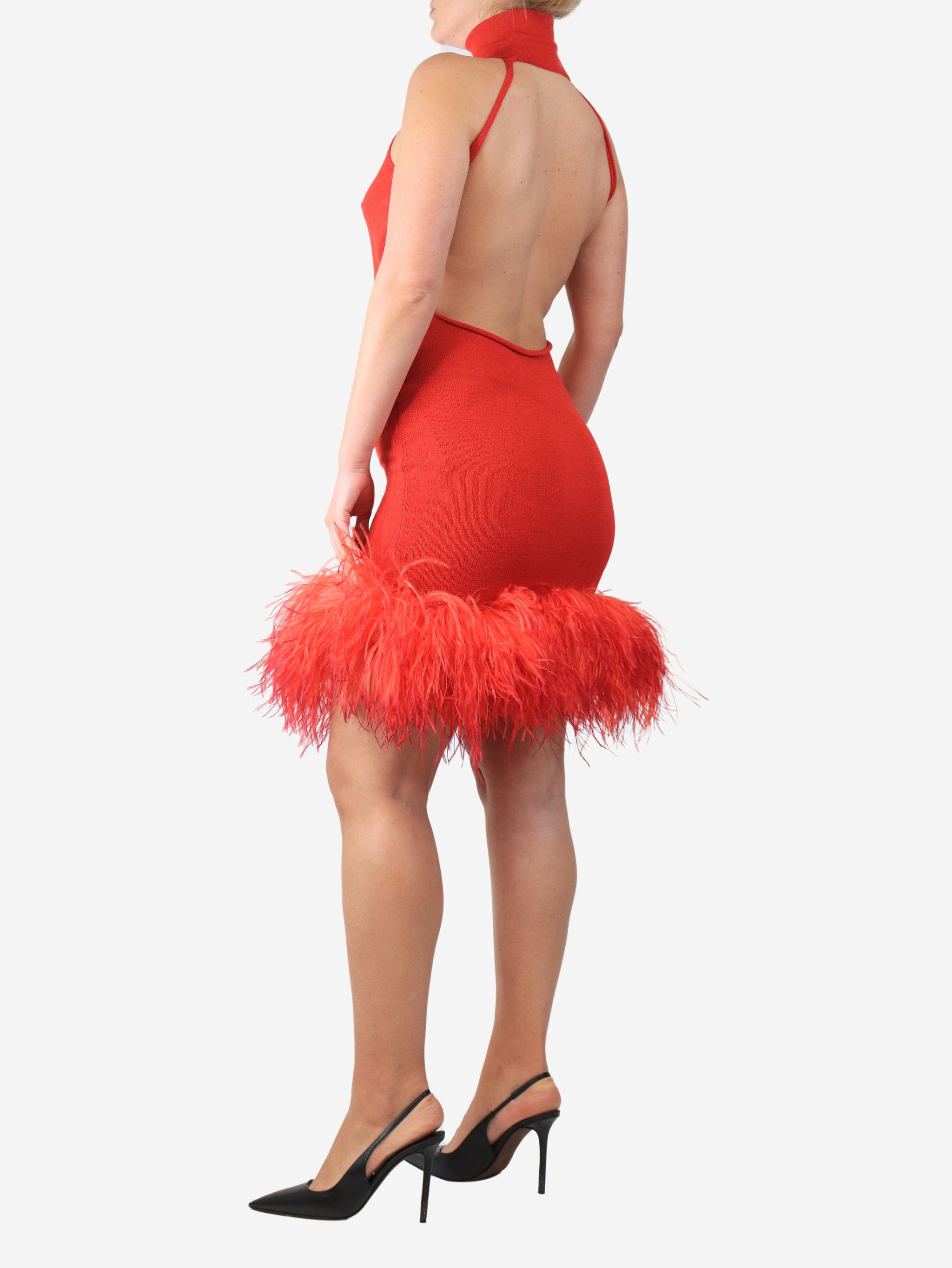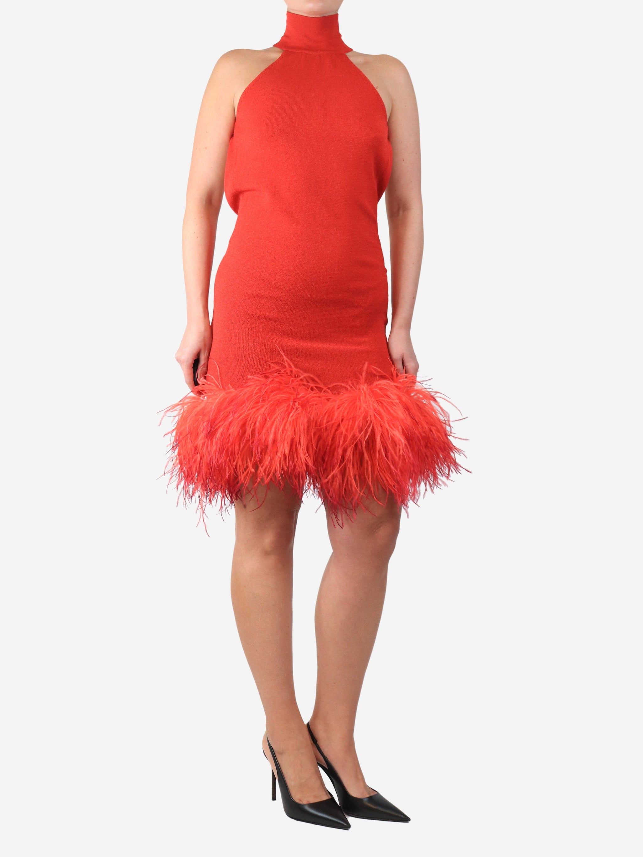 Red sleeveless high-neck feather-trim dress - size