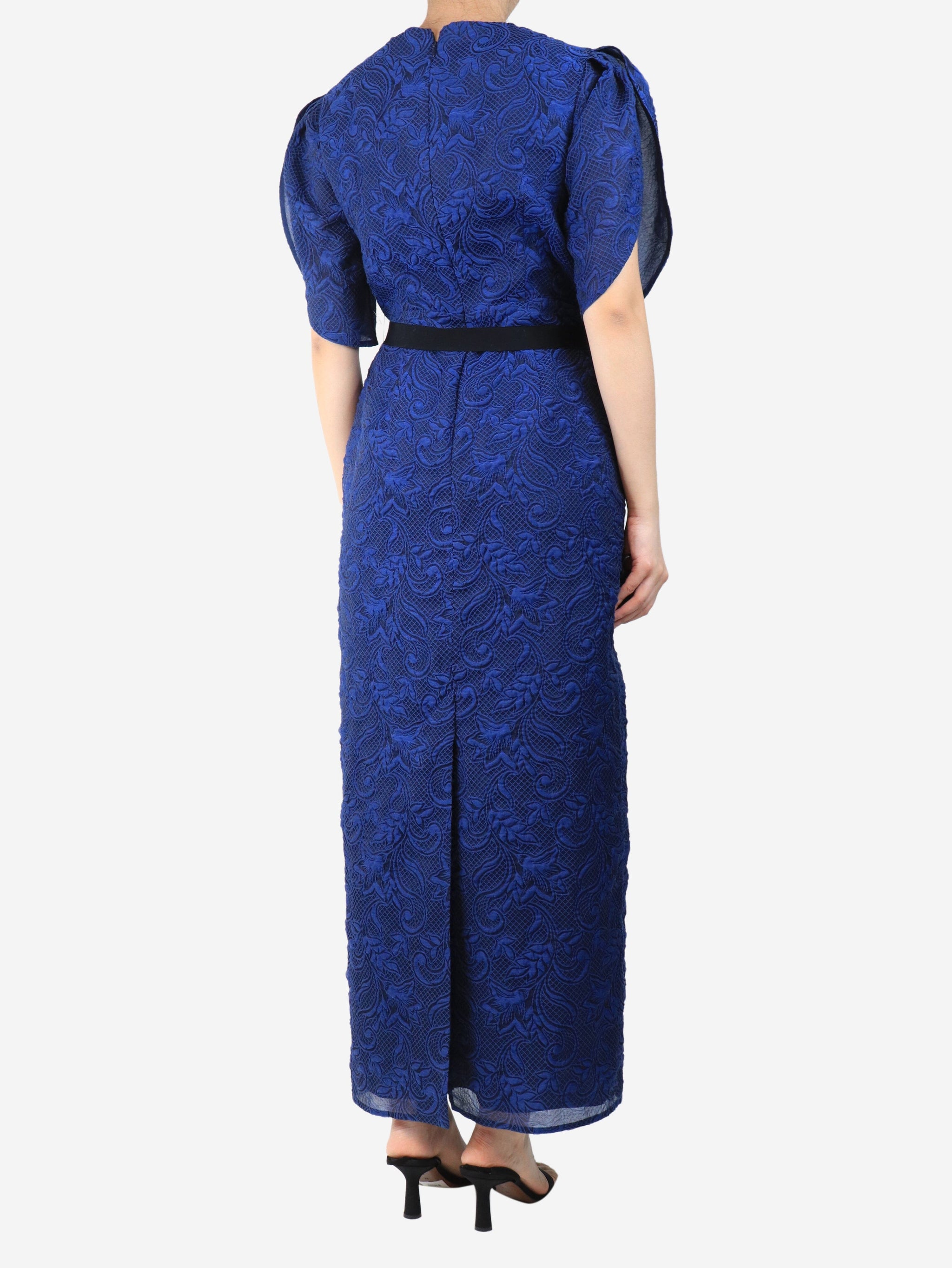 Blue organza cloque belted midi dress - size UK 12