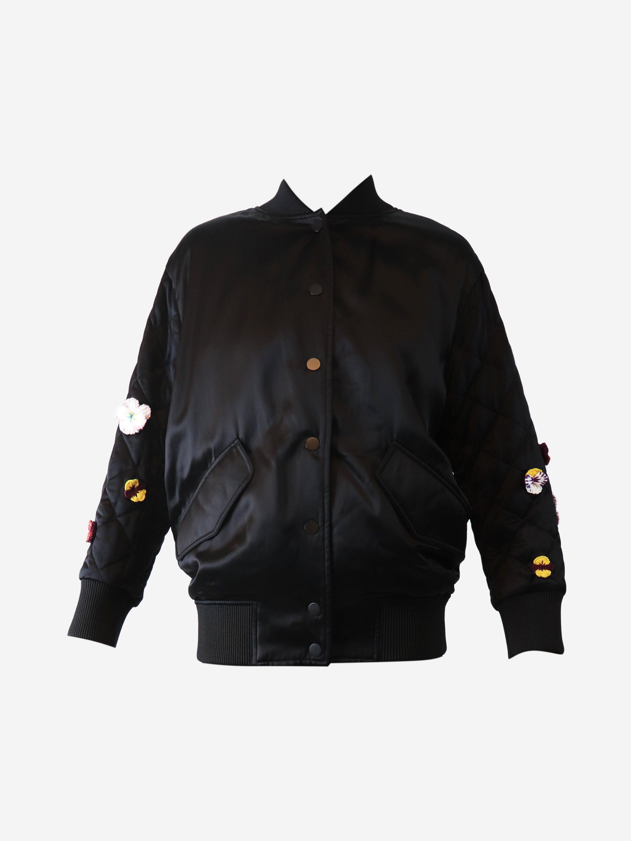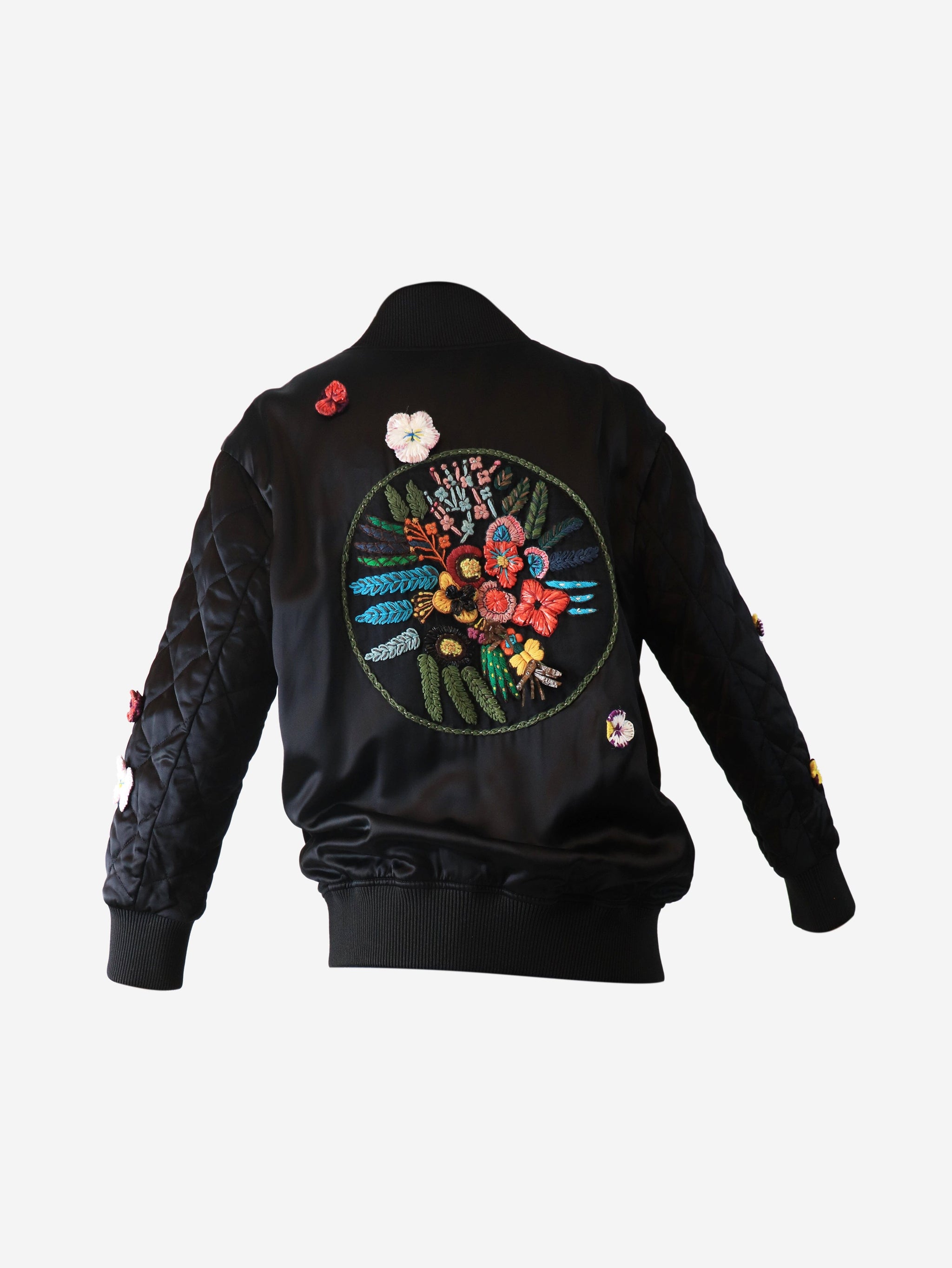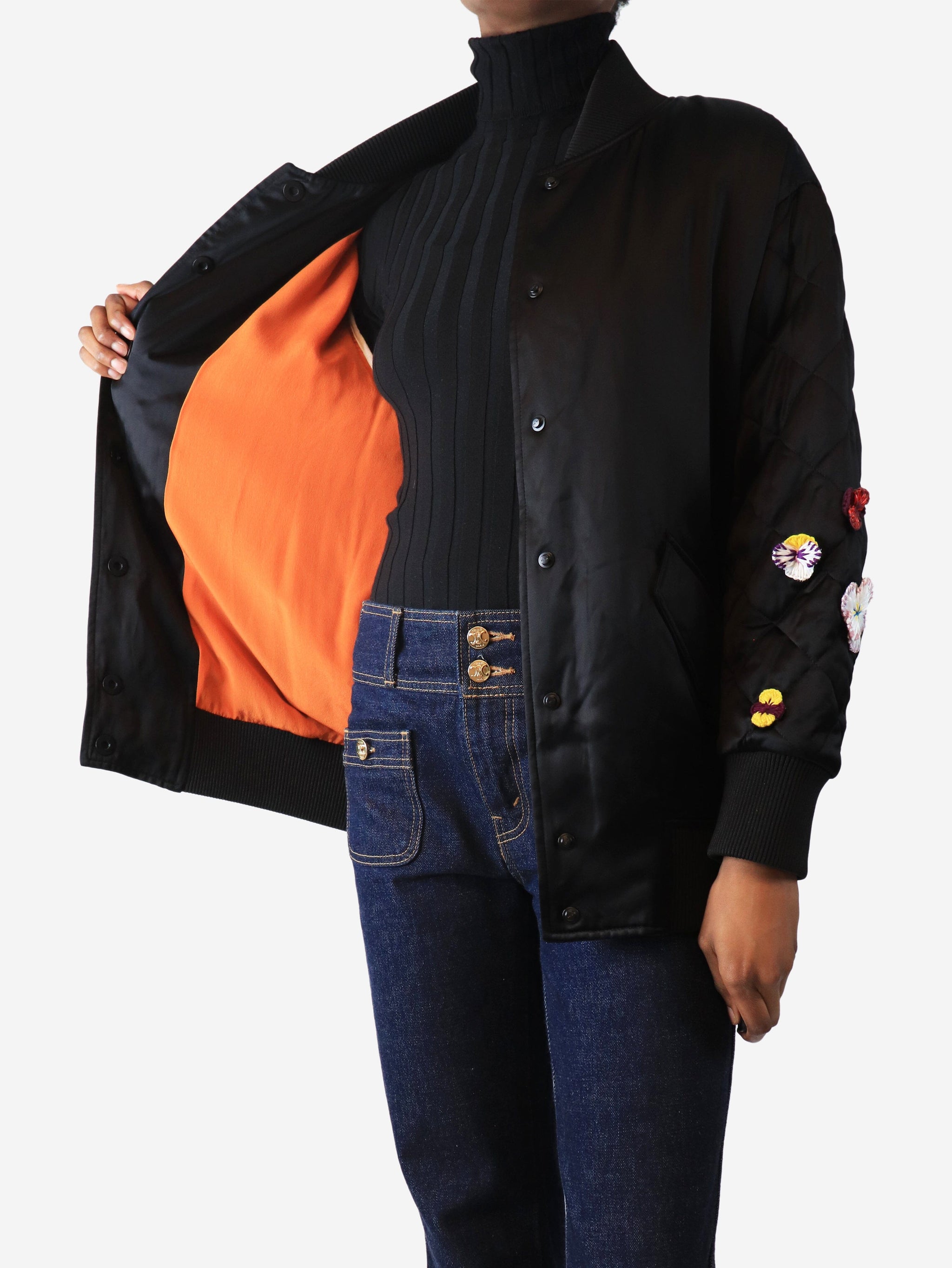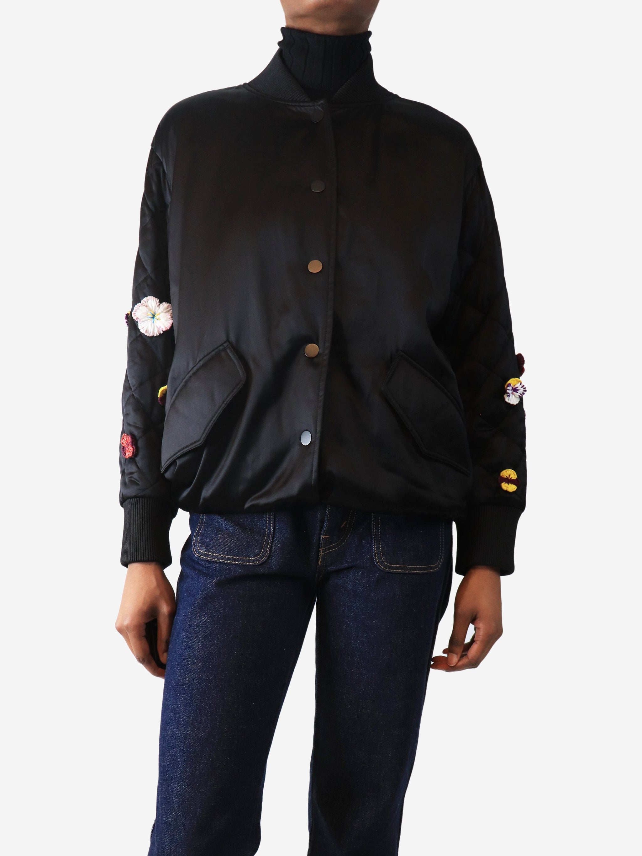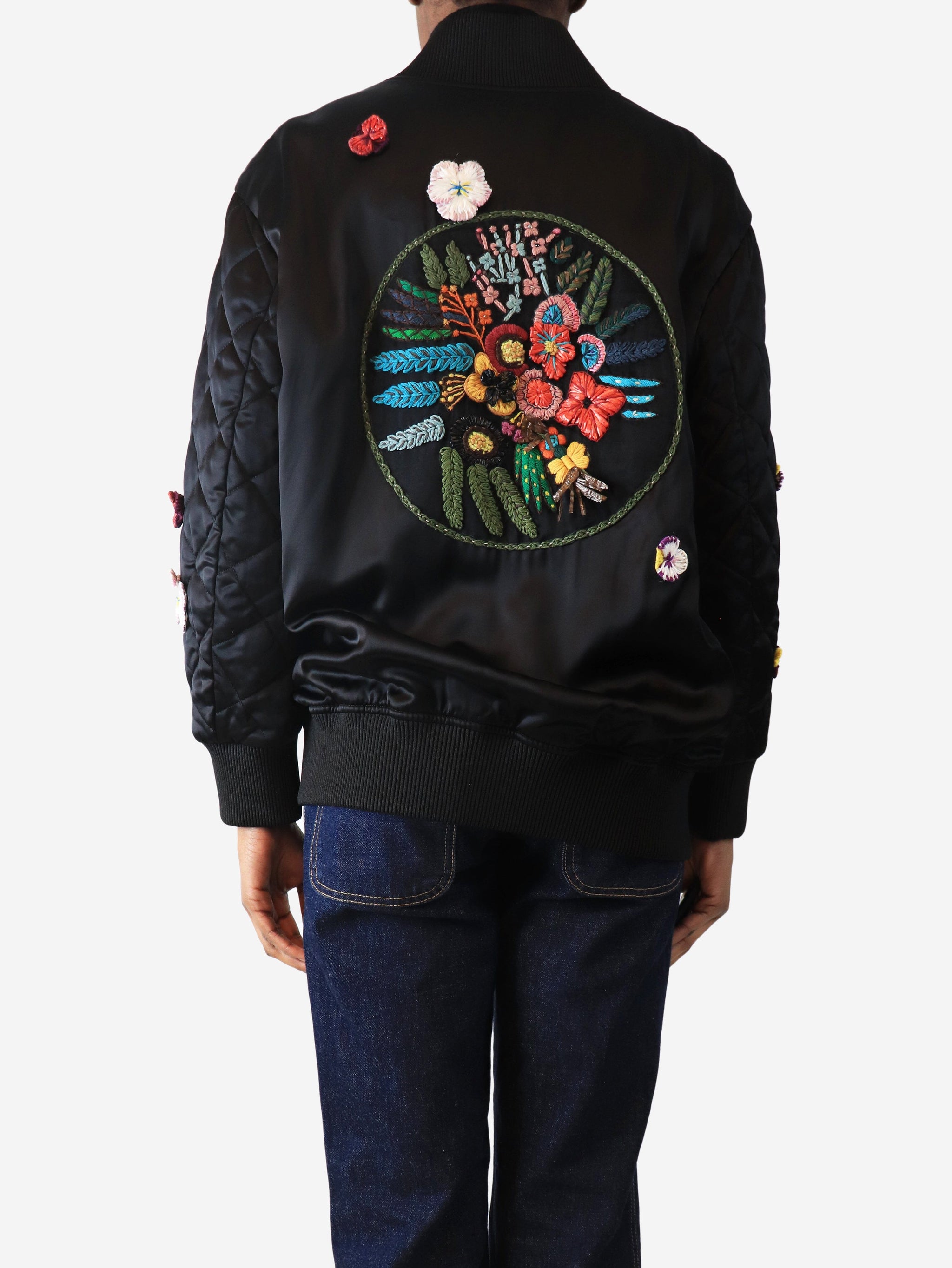 Black satin embroidered bomber jacket - size UK 6