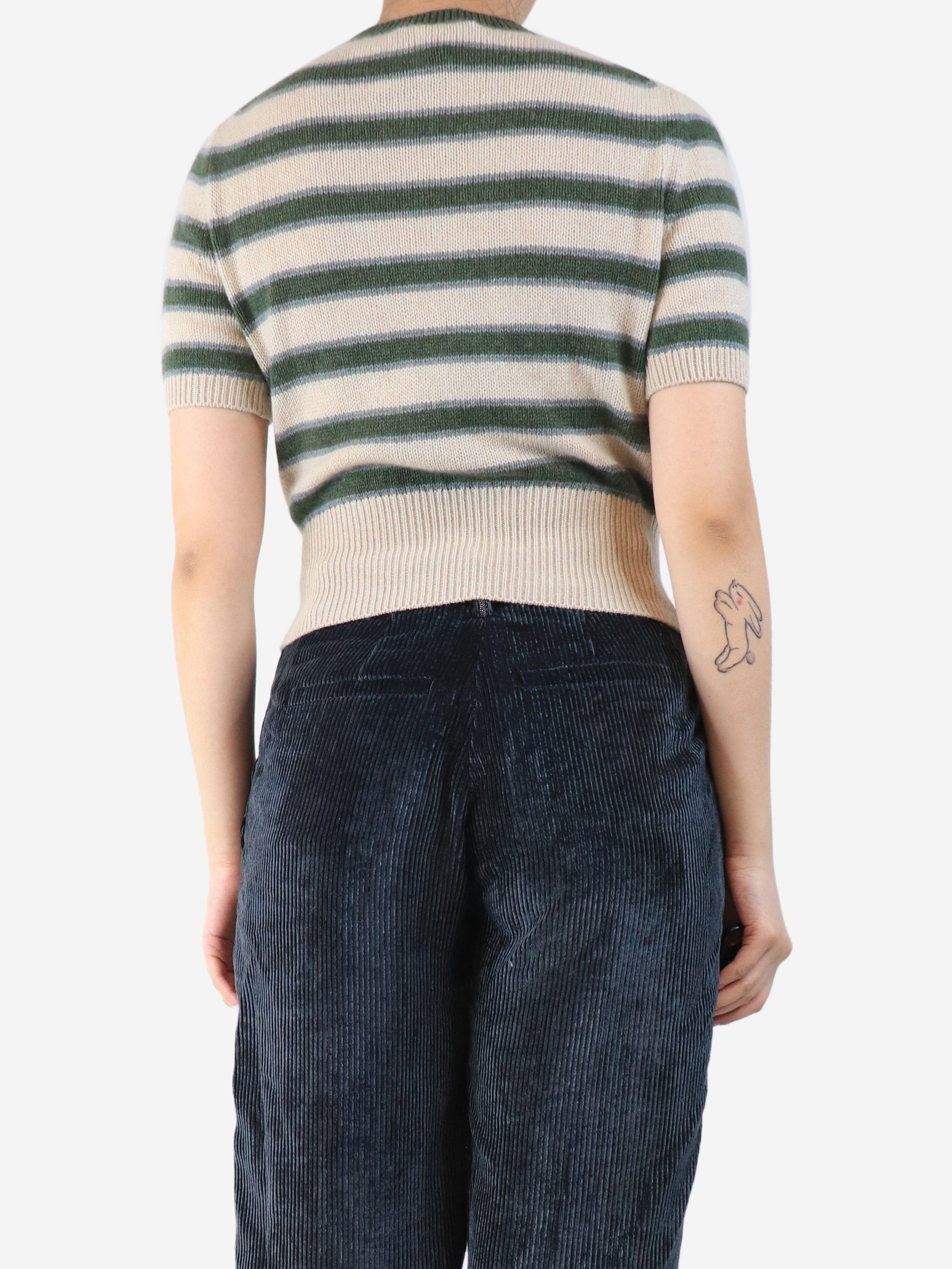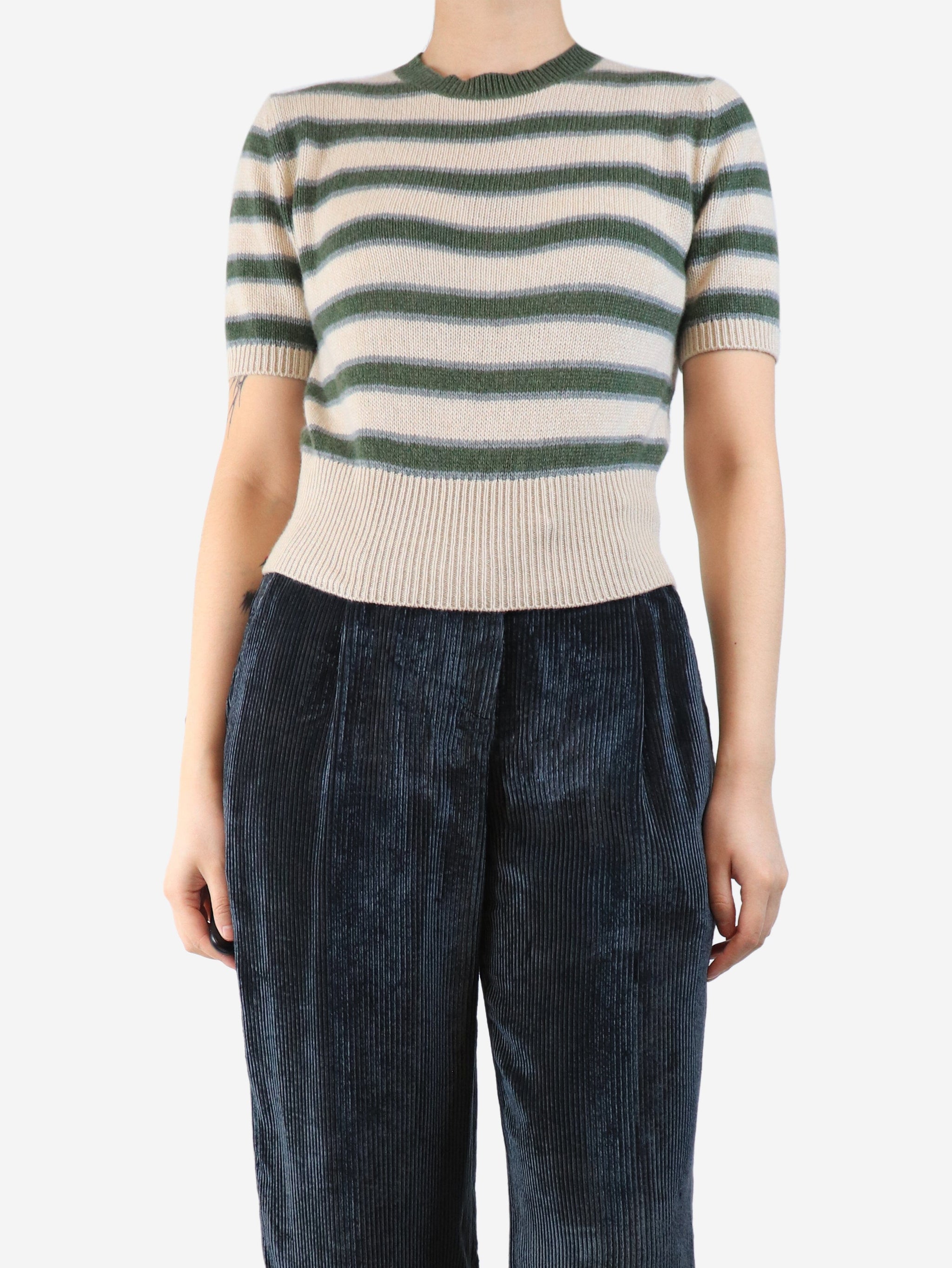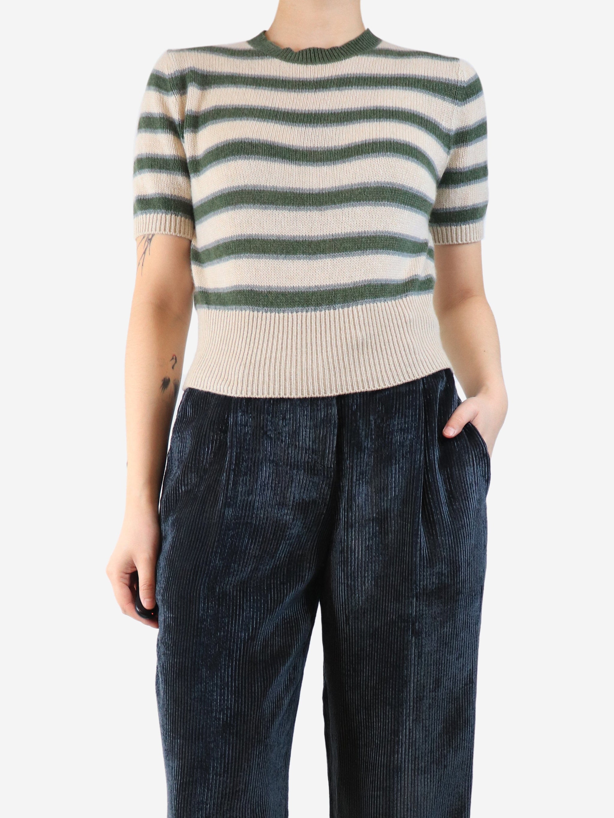 Green striped cashmere short sleeved top - size UK 8