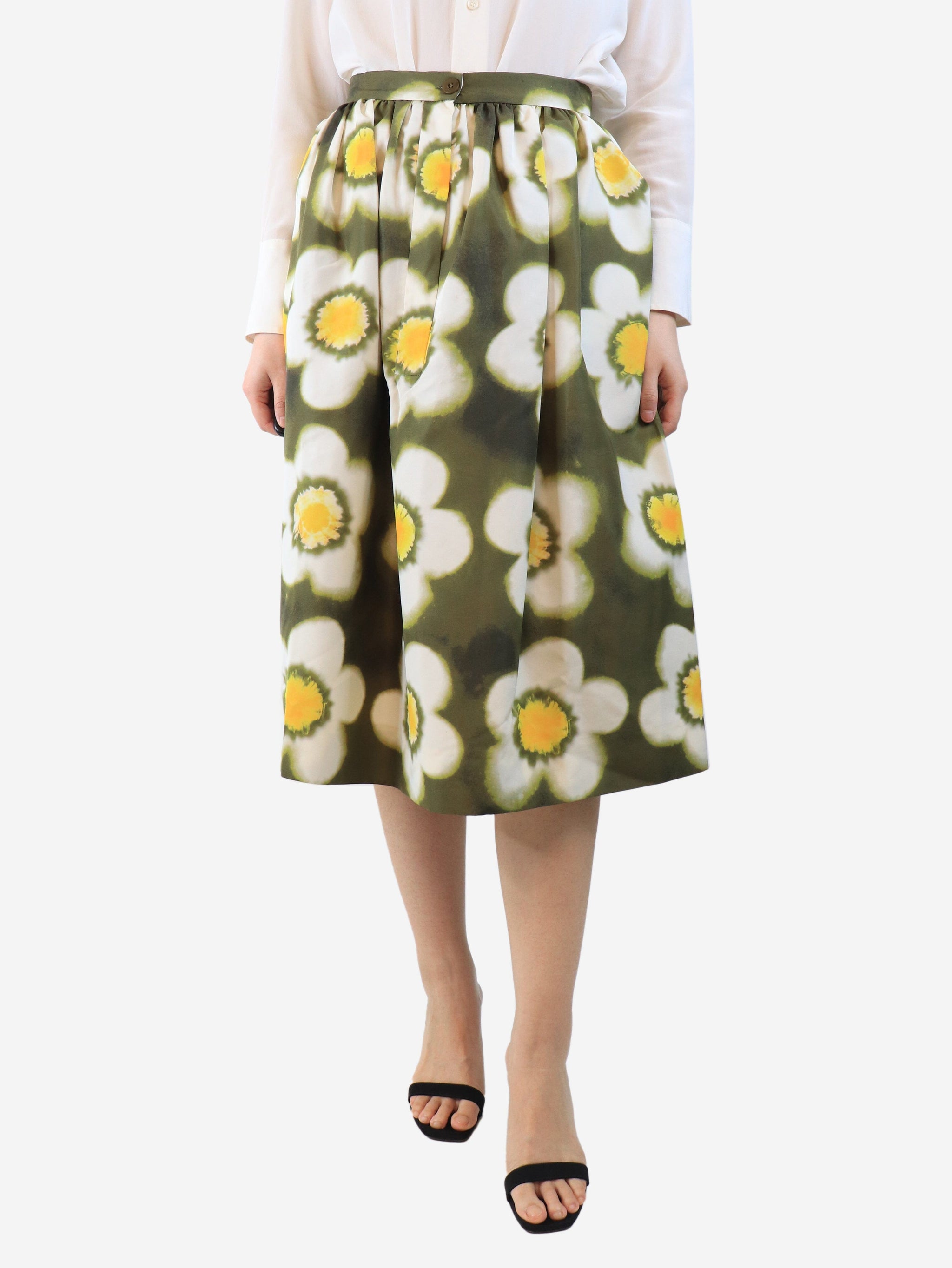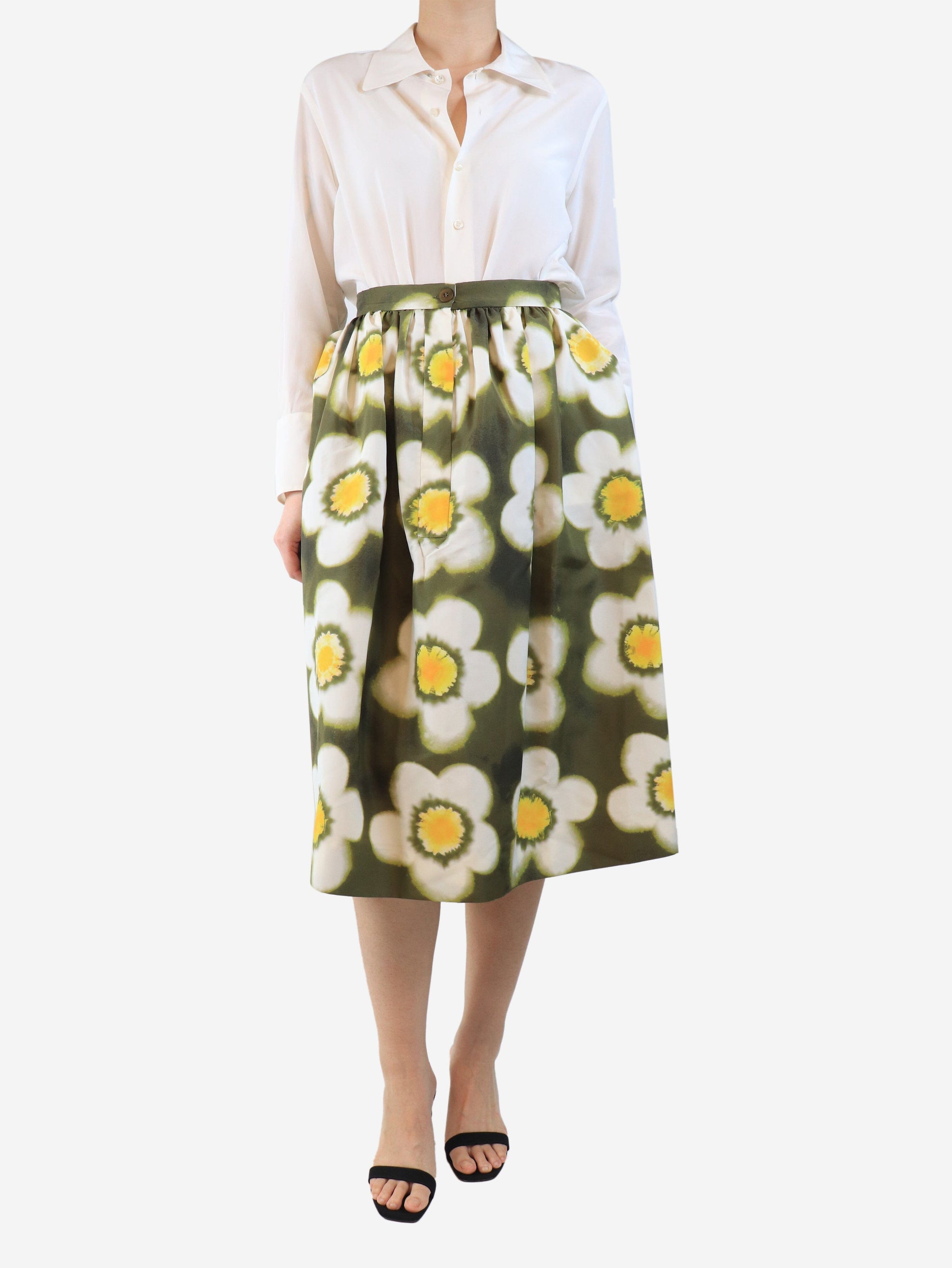 Khaki silk floral midi skirt - size UK 8