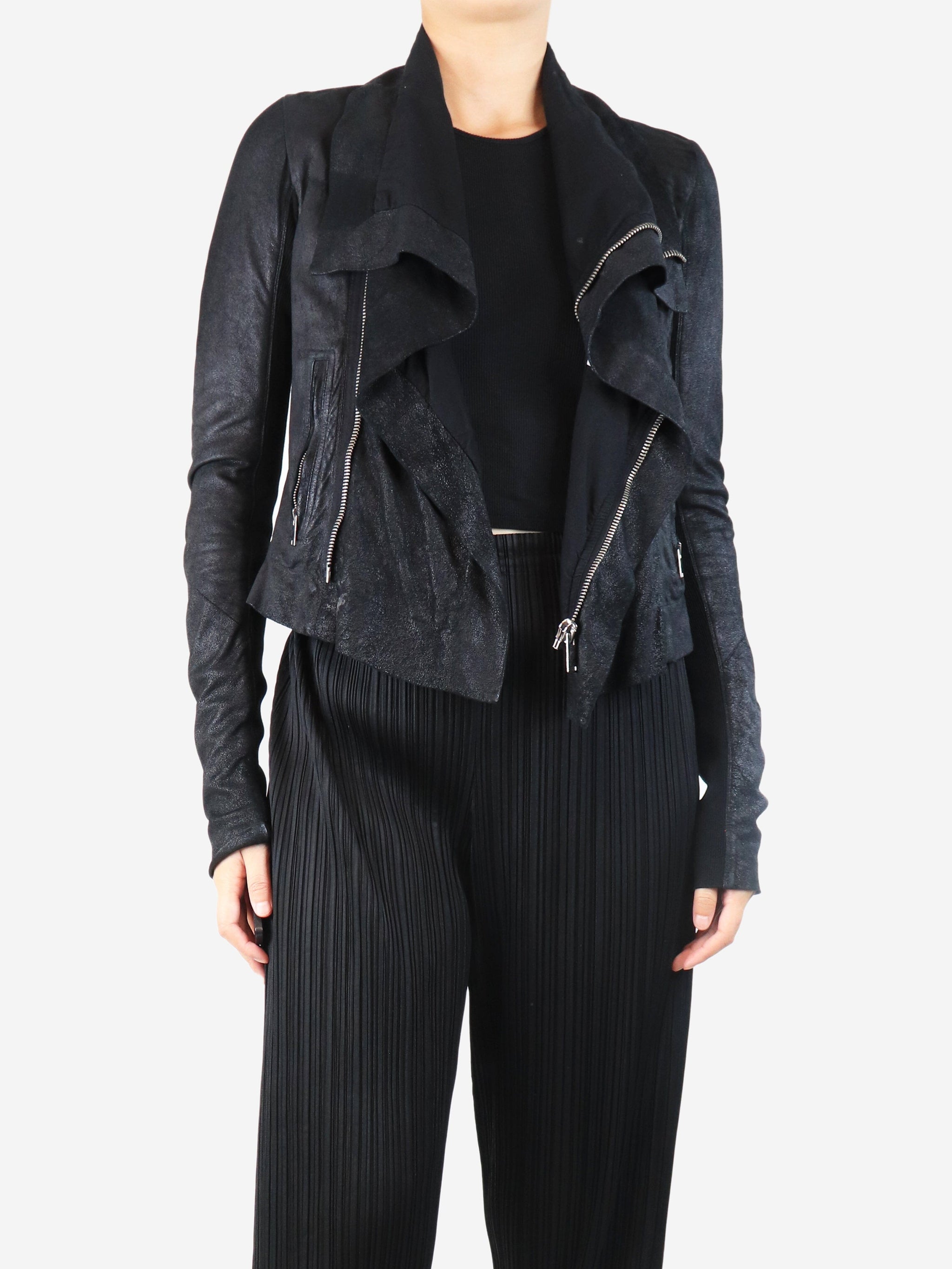 Black washed lamb leather biker jacket - size UK 8