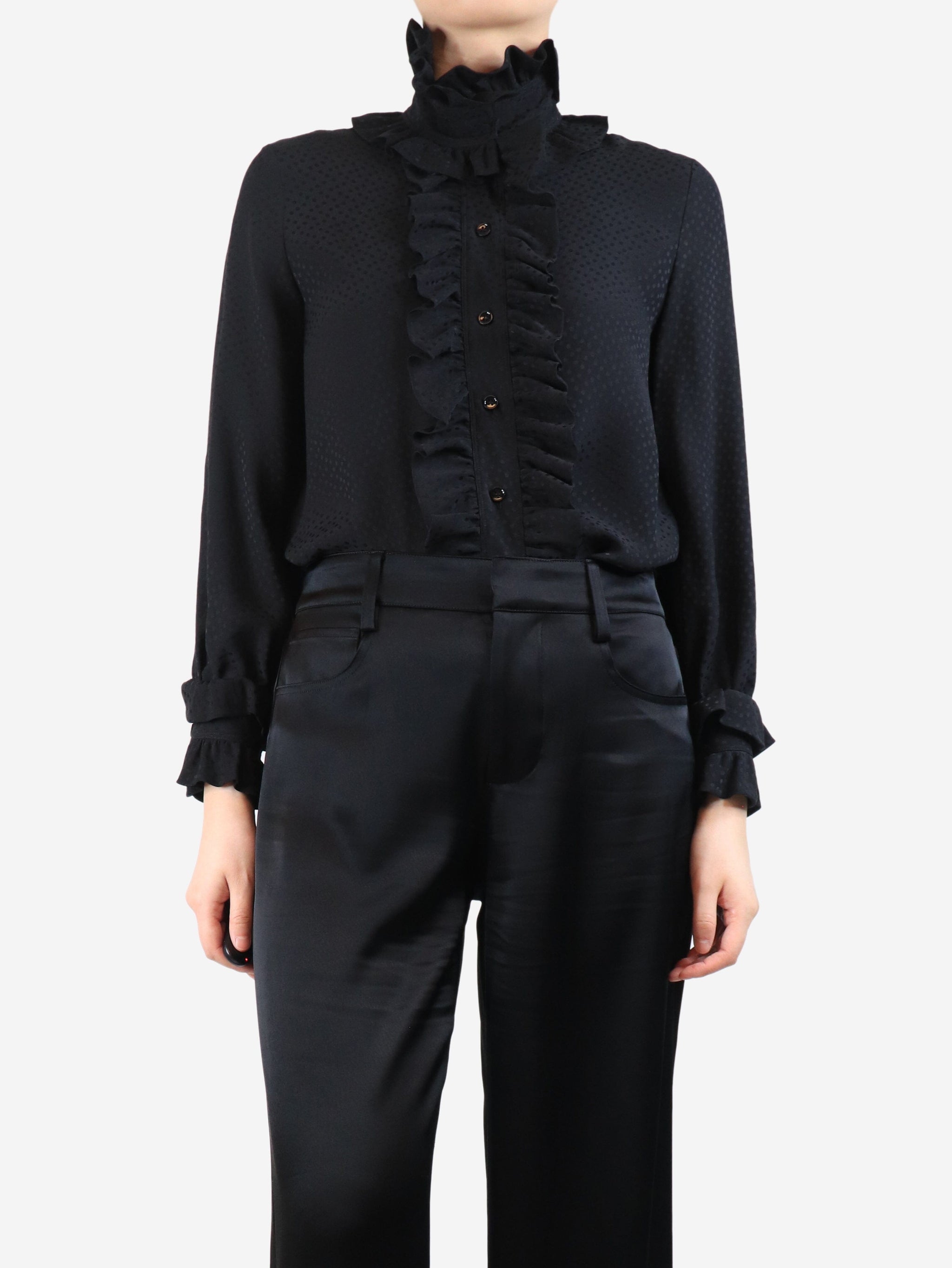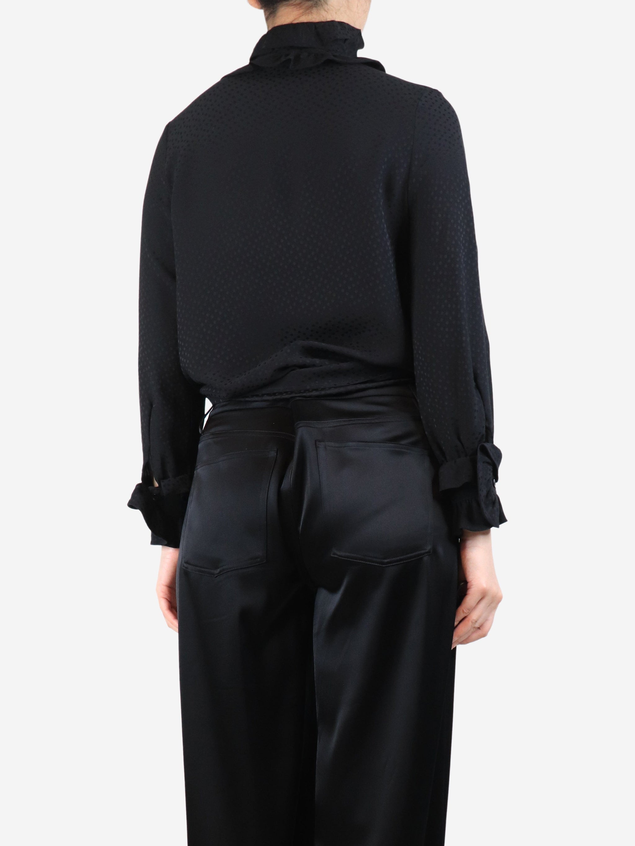 Black polka dot ruffle-front shirt - size UK 8