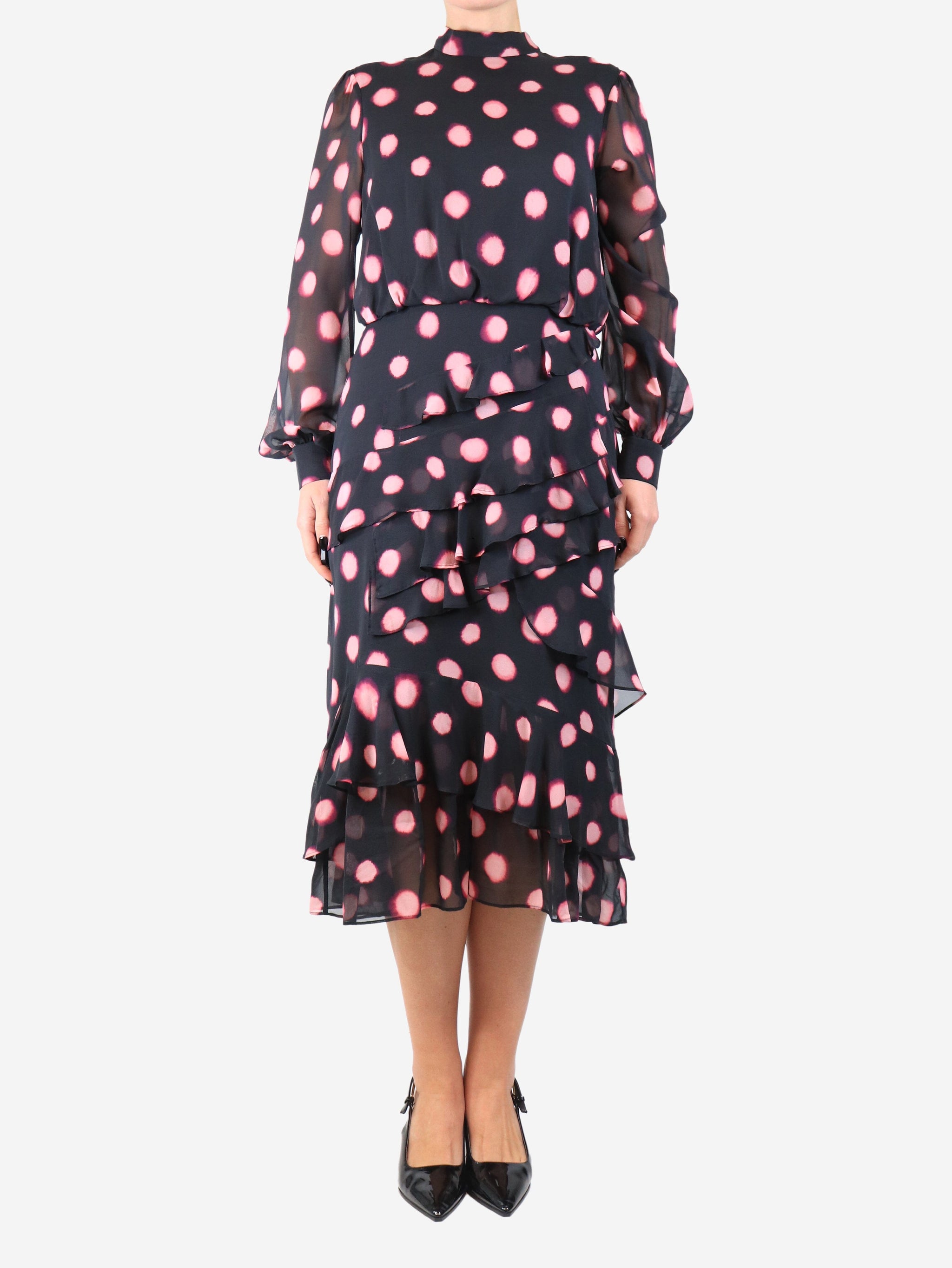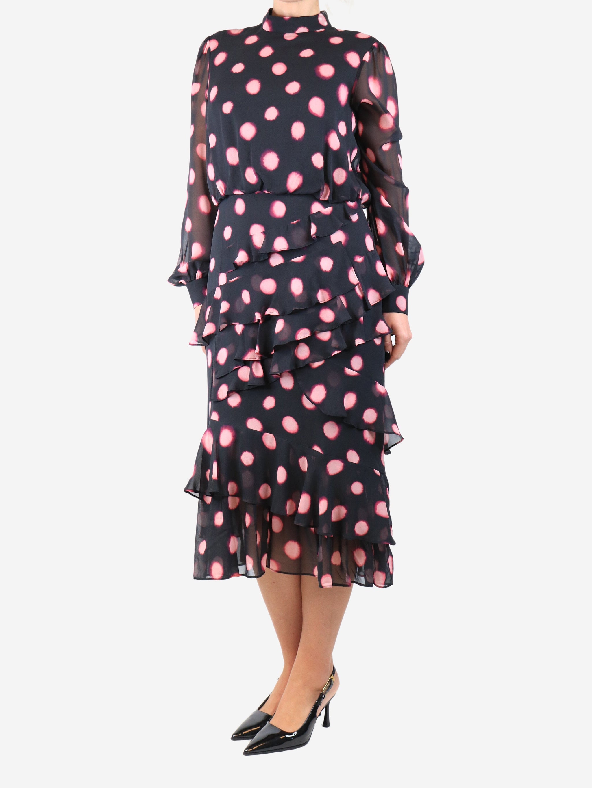 Black tie-dye polka dot ruffled midi dress - size UK 12