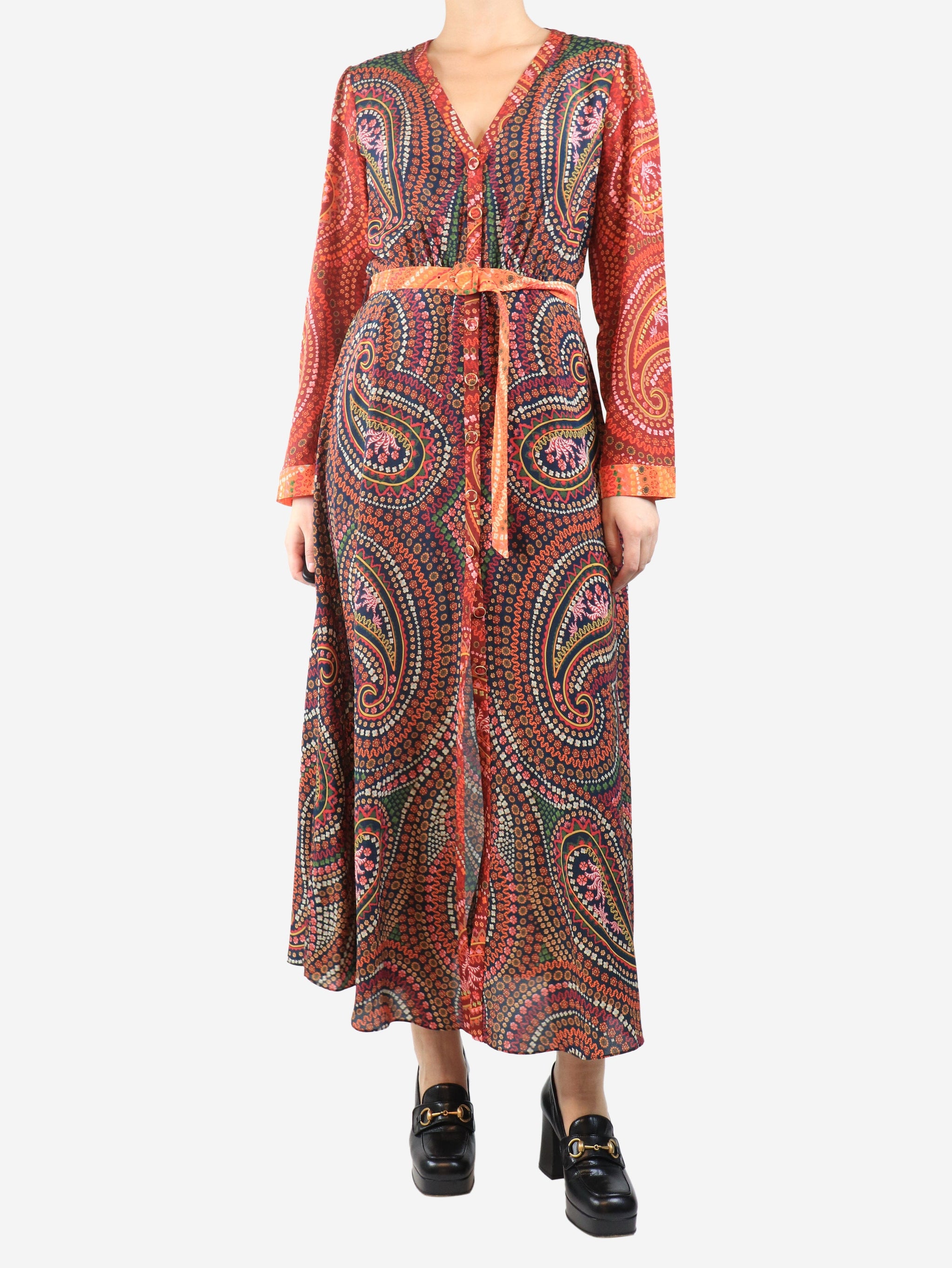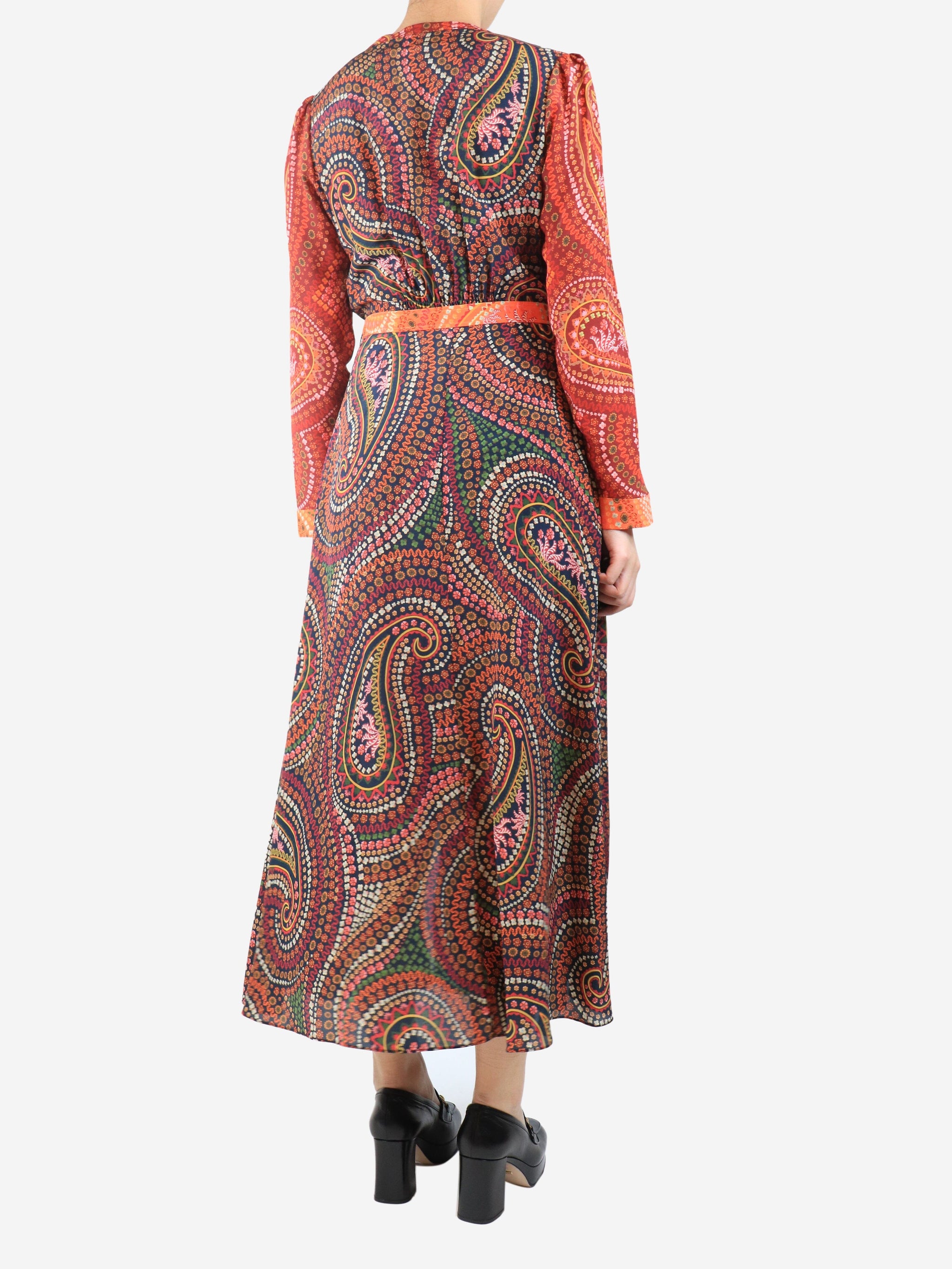 Multicolour silk floral paisley belted midi dress - size UK 12