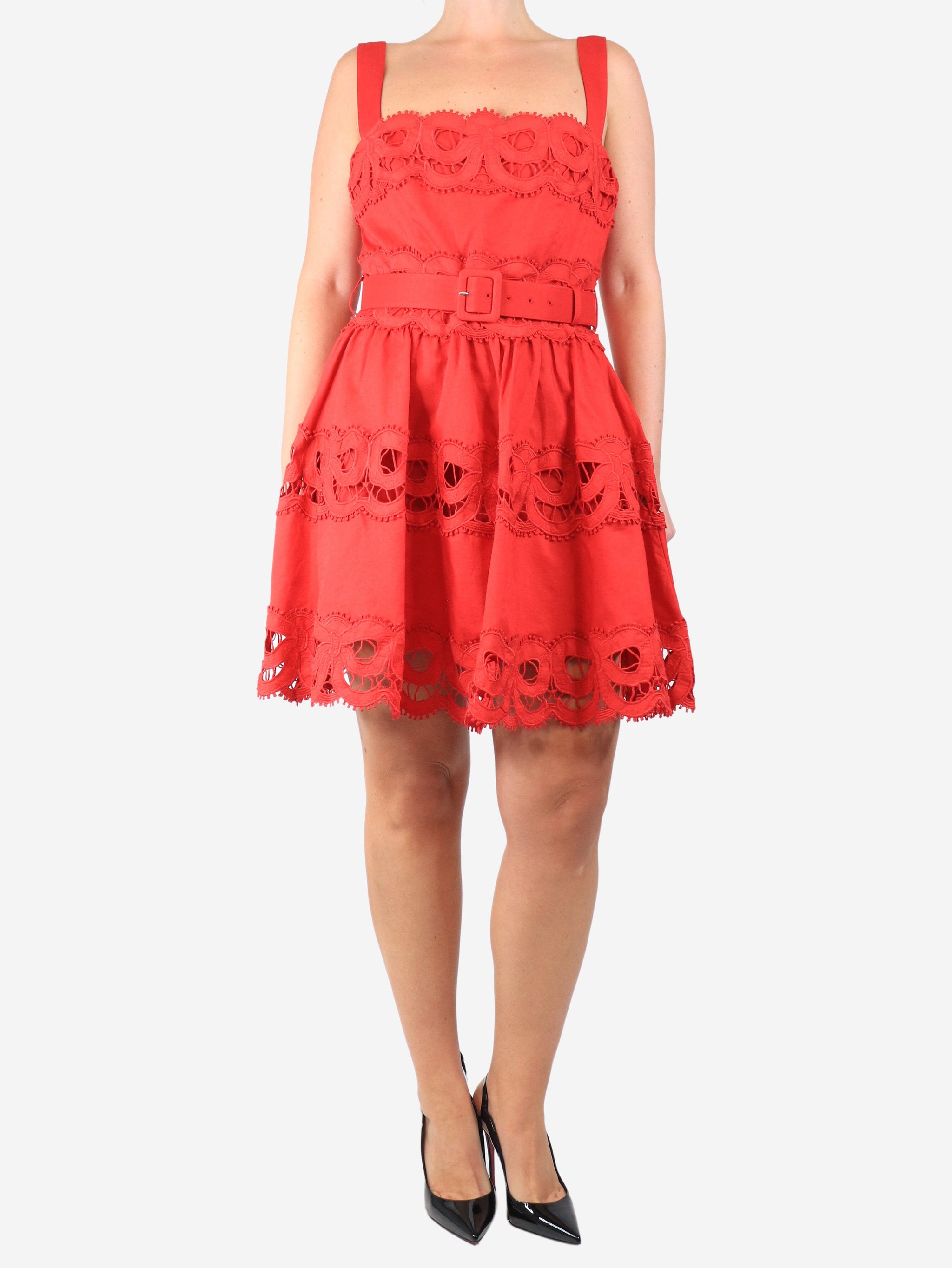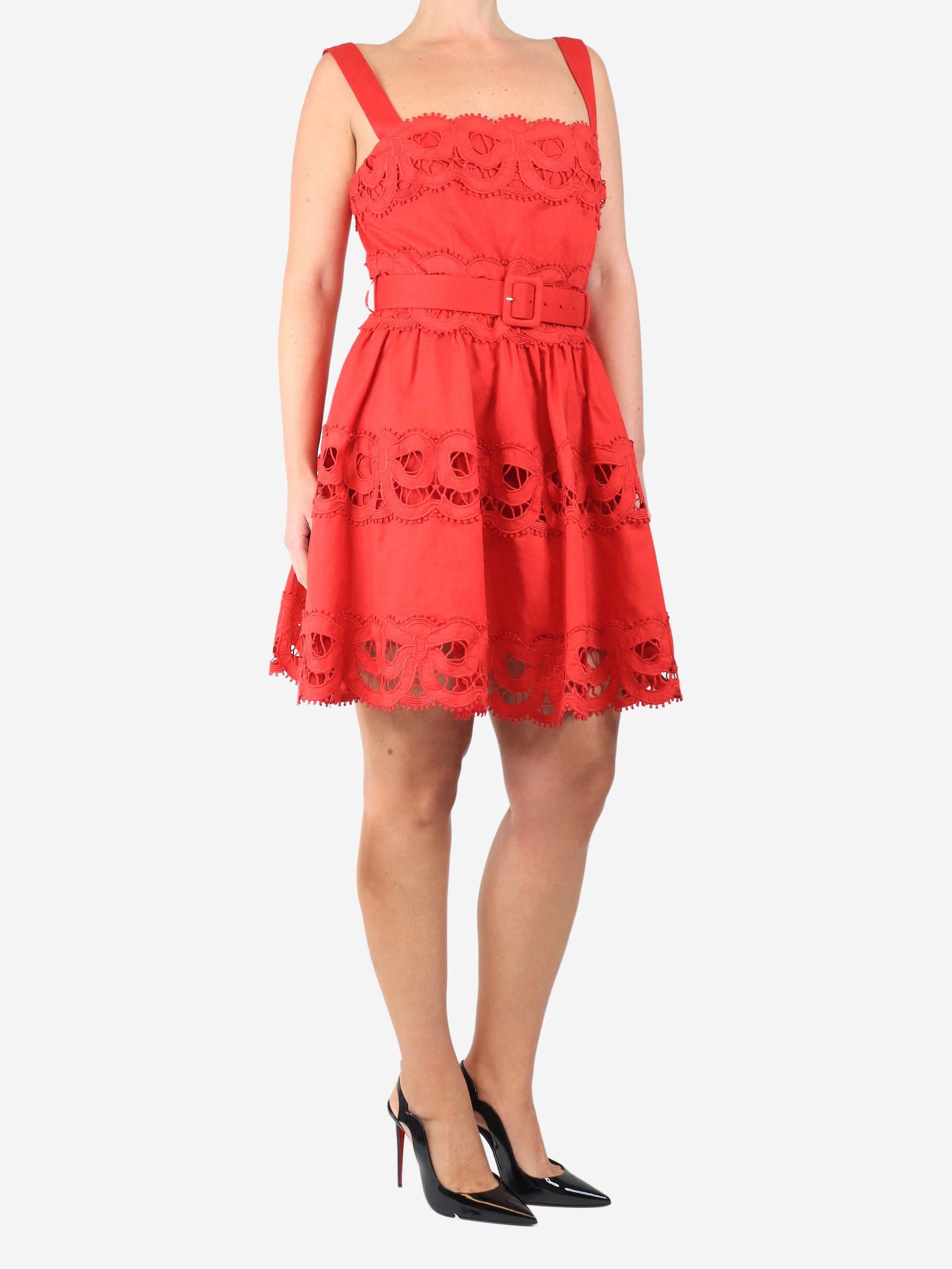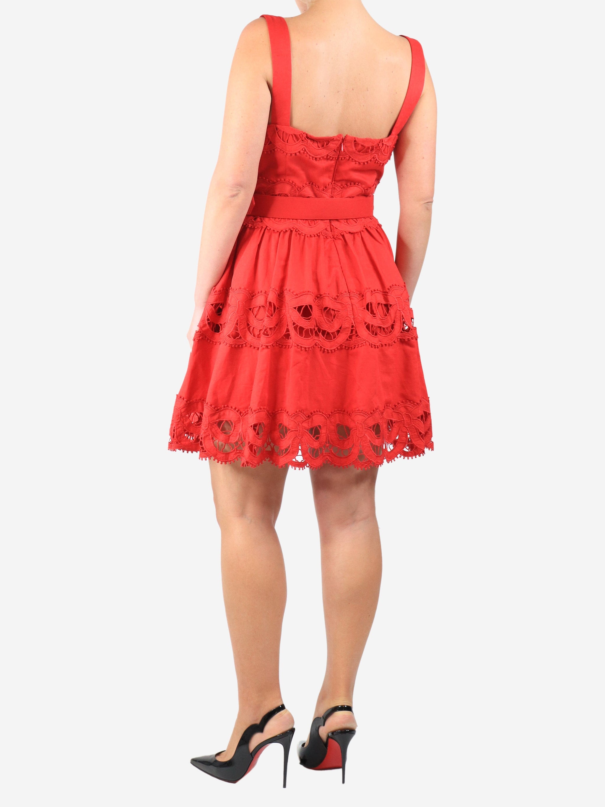 Red embroidered linen mini dress - size UK 12