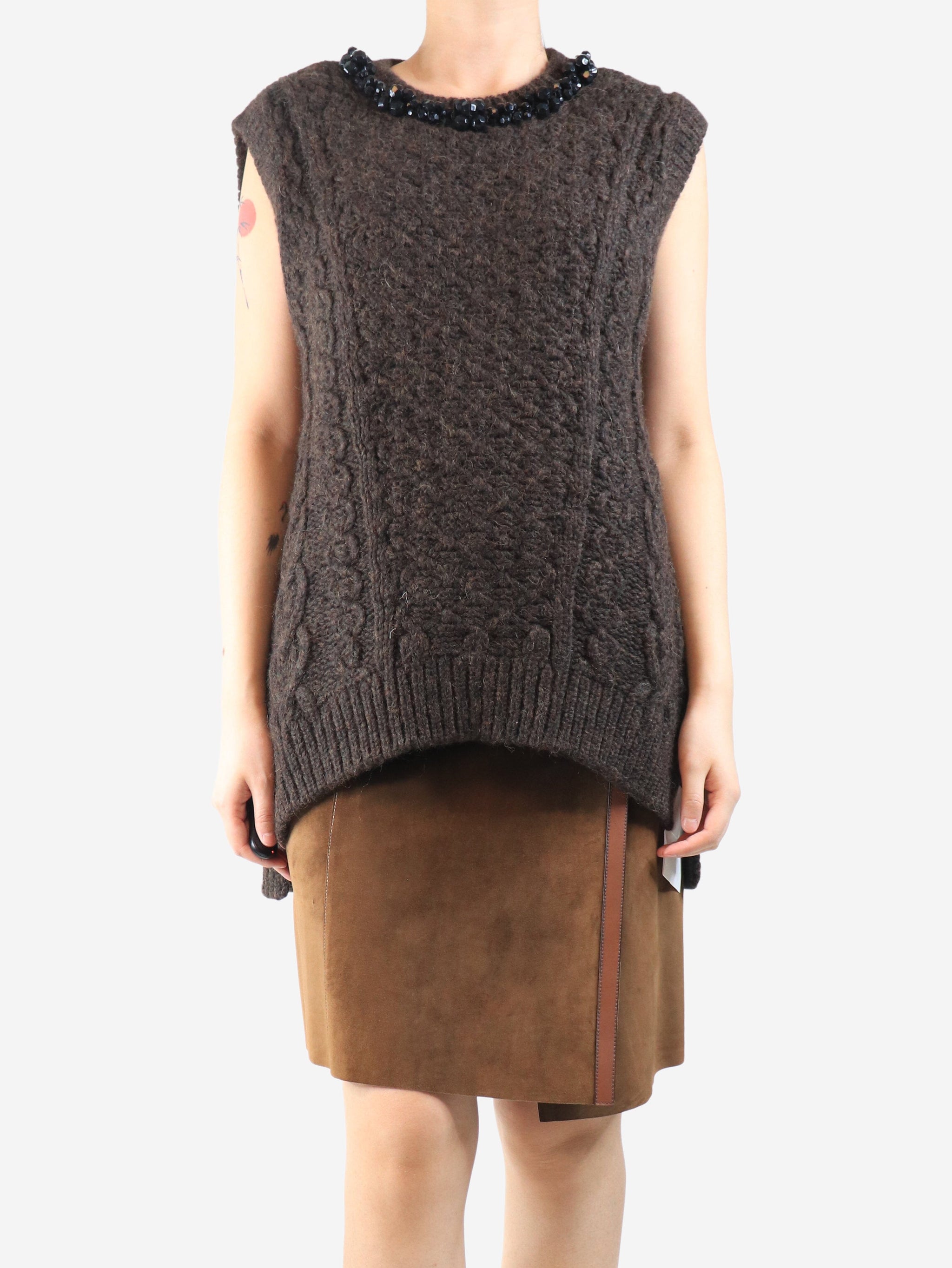 Brown beaded sleeveless chunky knit top - size L