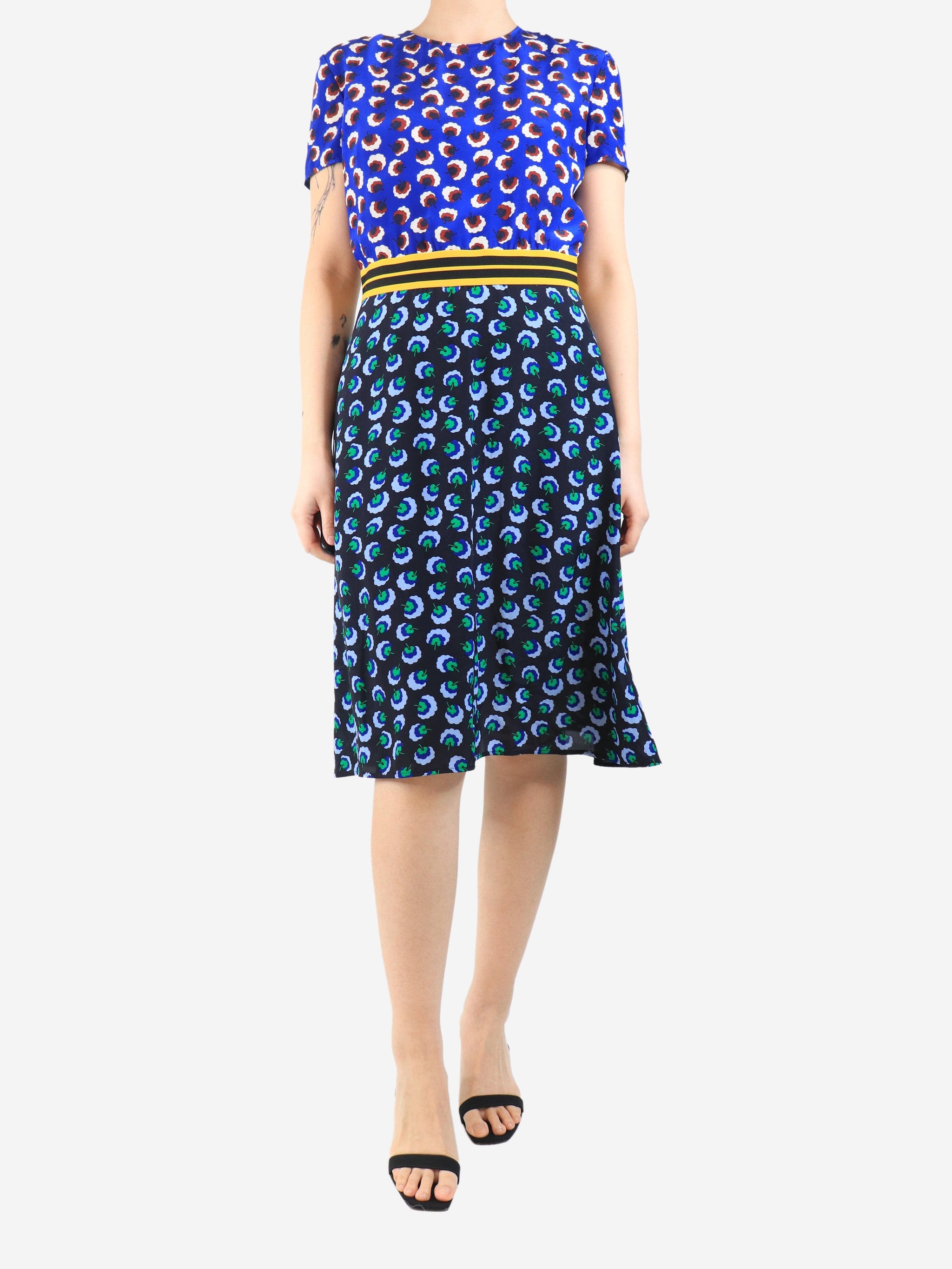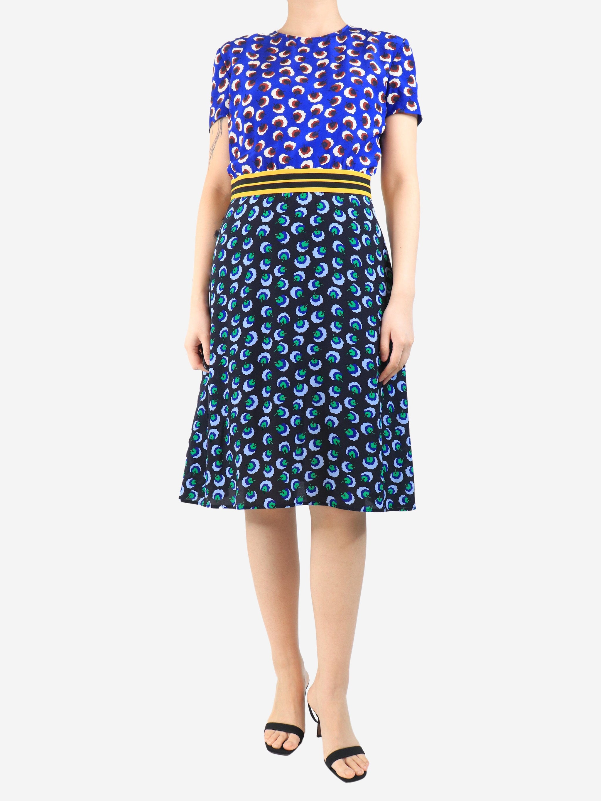 Blue silk printed midi dress - size UK 12